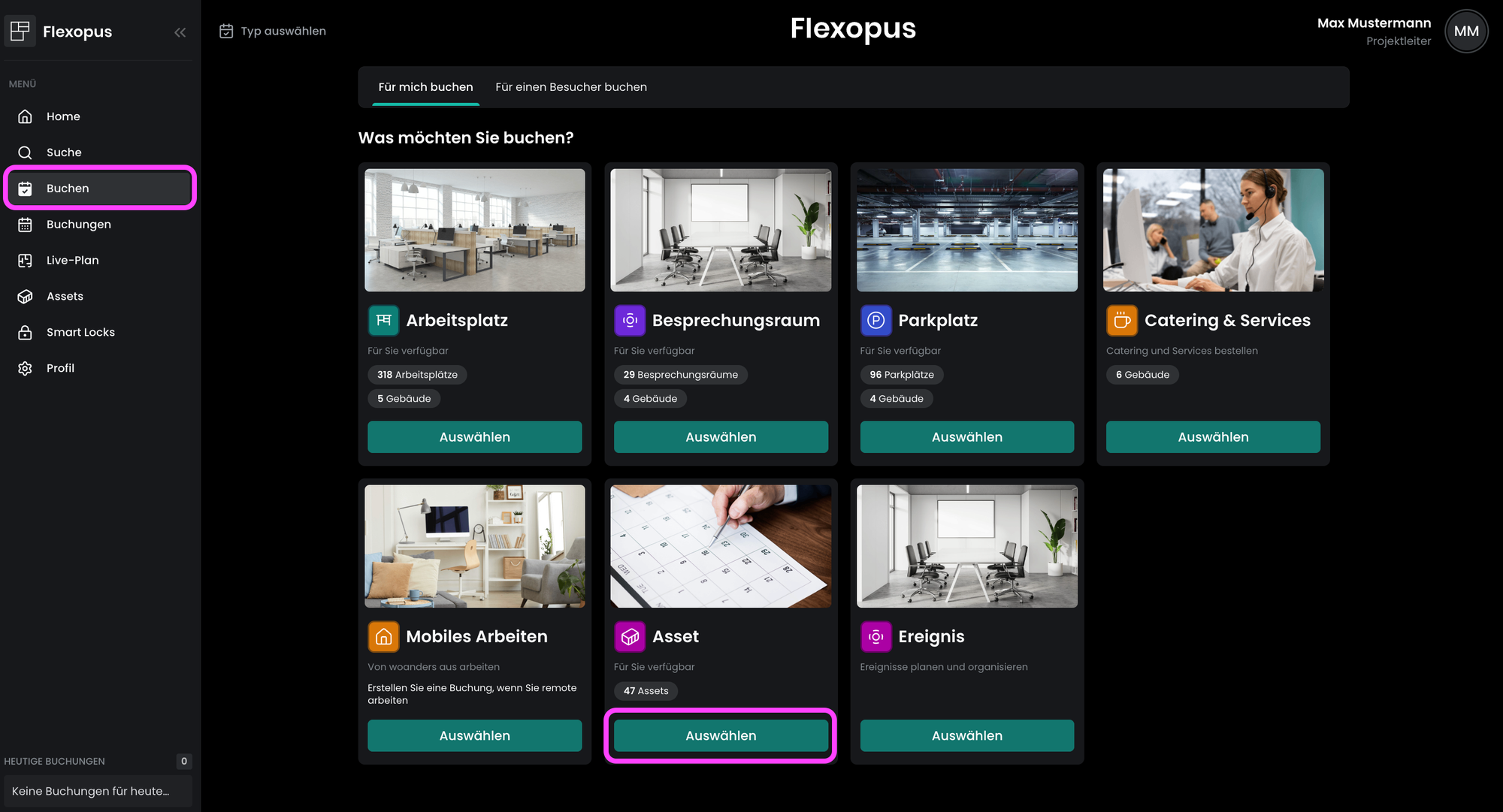 Das Asset, das gebucht werden soll. Den Verfügbarkeitsstatus des Assets sehen Sie immer auf der rechten Seite unter „Buchungsstatus“.