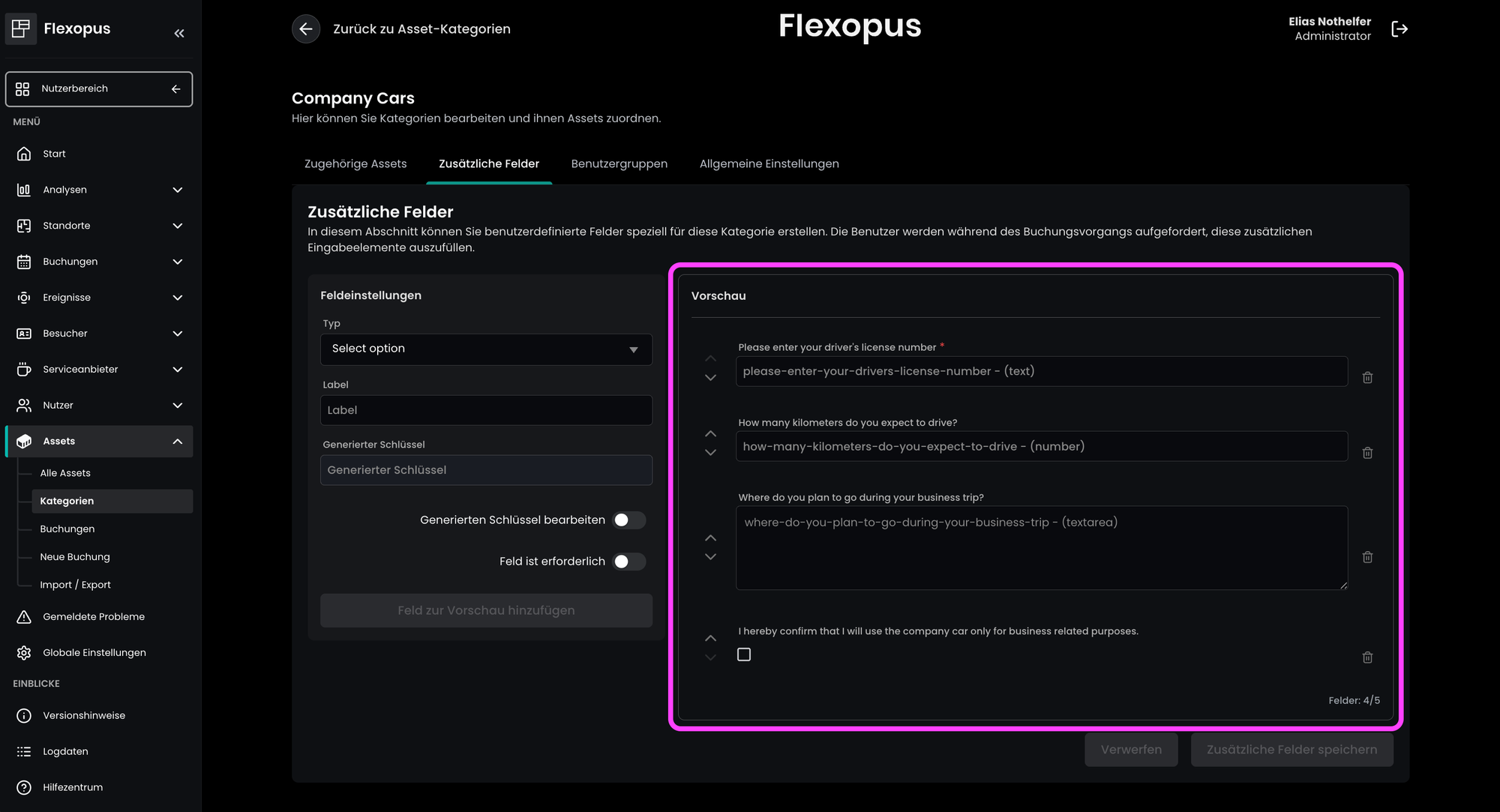 Sie können für jede Kategorie bis zu 5 zusätzliche Felder definieren, die während des Buchungsvorgangs für ein Asset dieser Kategorie angezeigt werden. Sie können beispielsweise Eingabefelder definieren, in denen Benutzer bei der Buchung eines Firmenwagens ihre Führerscheinnummer eingeben müssen, oder Sie können ein Kontrollkästchen hinzufügen, um sicherzustellen, dass Benutzer vor der Bestätigung einer Buchung einen bestimmten Hinweis lesen. Das Hinzufügen zusätzlicher Felder muss zunächst in den globalen Einstellungen der Anlagenverwaltung unter Globale Einstellungen > Anlagenverwaltung > Zusätzliche Felder zu Kategorien hinzufügen aktiviert werden. Die zusätzlichen Felder haben die folgenden Einstellungen: