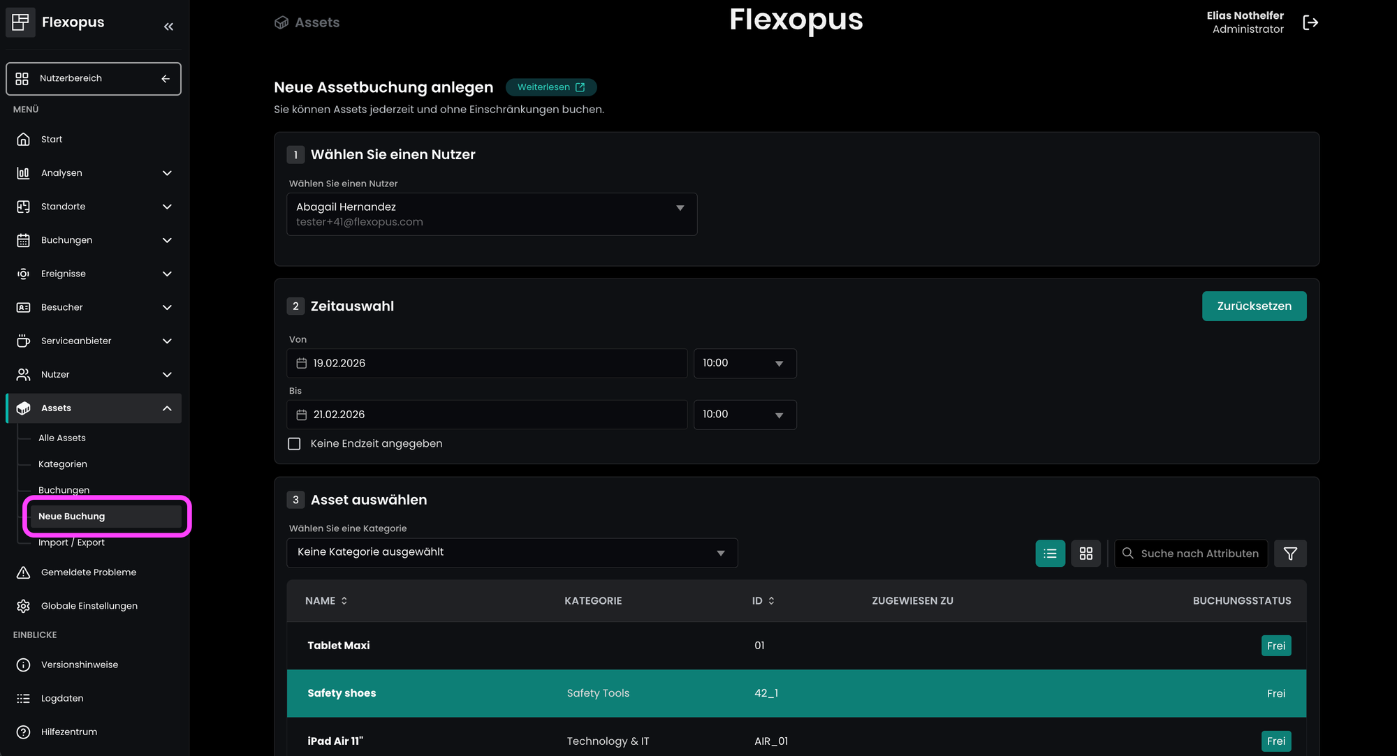 Im Admin-Bereich können Sie alle Asset-Buchungen erstellen und verwalten.