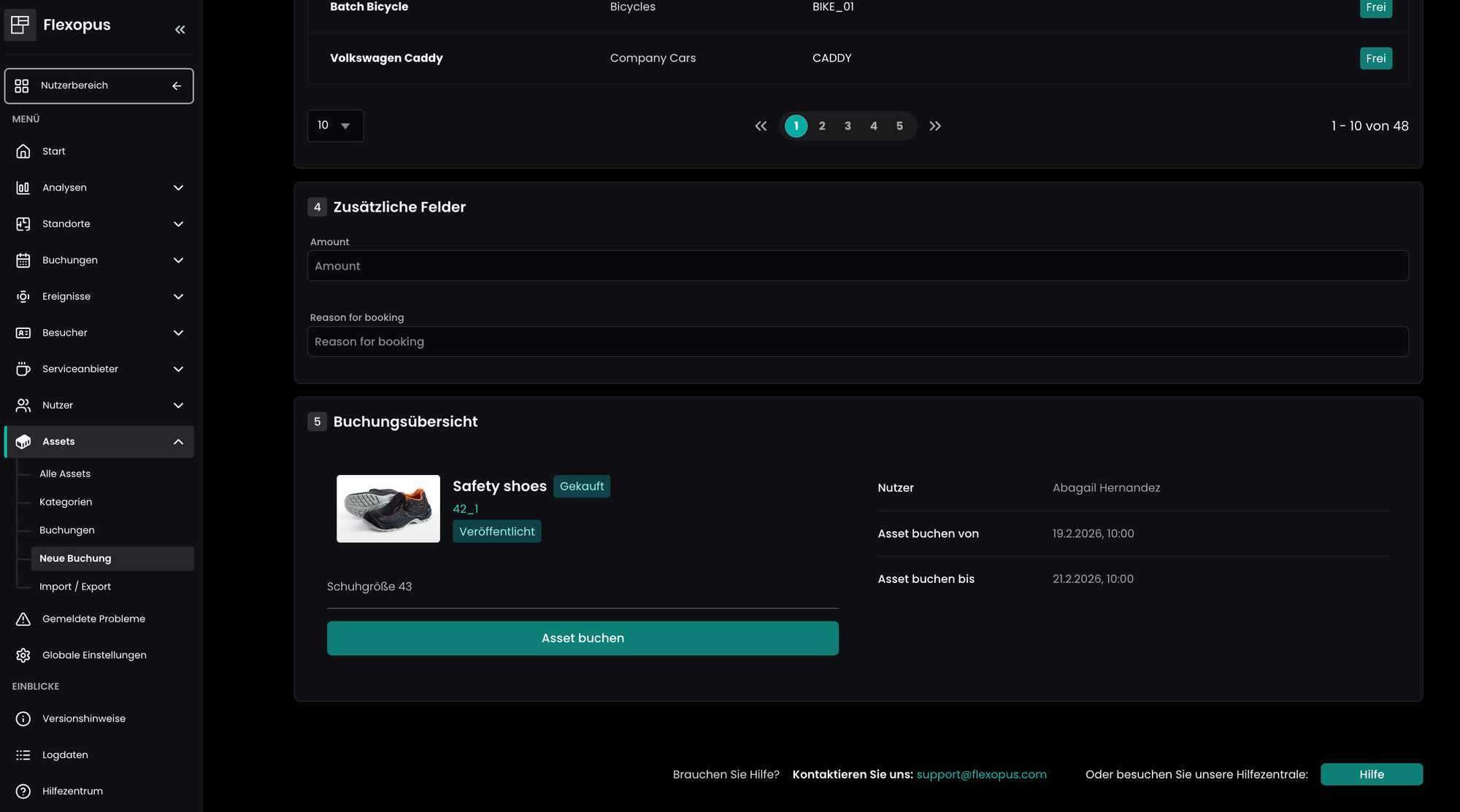 Um eine Asset-Buchung für andere Benutzer zu erstellen, erstellen Sie einfach eine neue Buchung im Admin-Menü. Die folgenden Informationen müssen angegeben werden:
