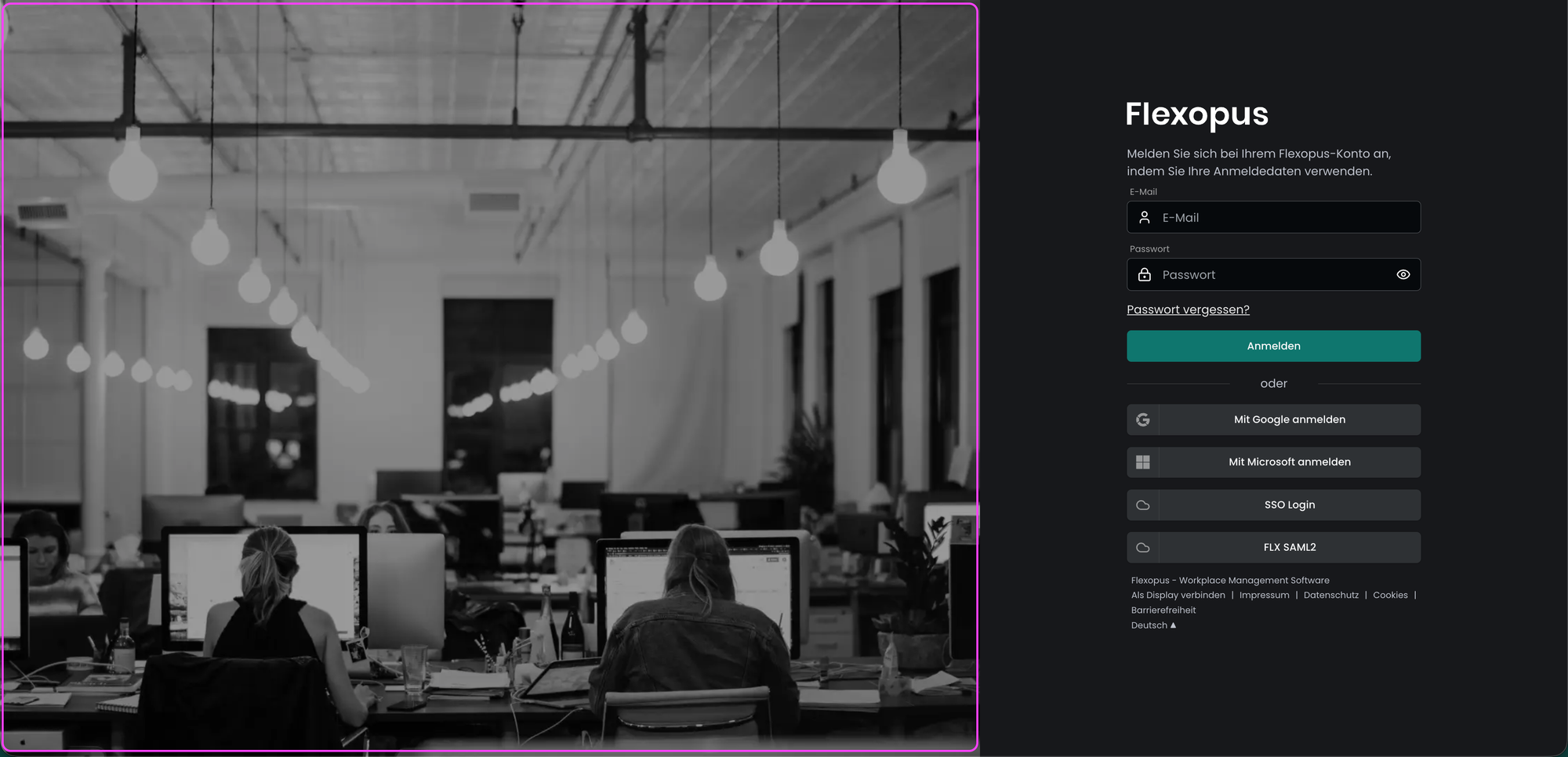 Navigieren Sie in Flexopus als Administrator zu Dashboard > Einstellungen > Corporate Identity. Hier können Sie ein Begrüßungsbild hochladen, das anstelle des Standardbildes auf der Anmeldeseite Ihrer Anwendung angezeigt wird.