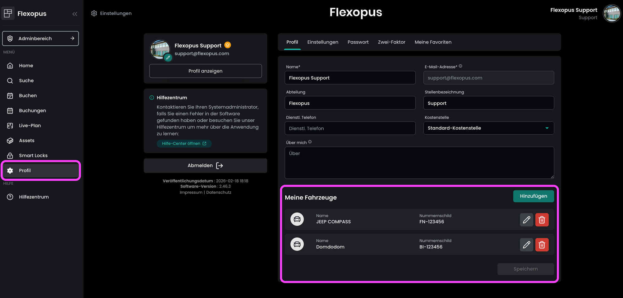 Benutzer können ihrem Profil mehrere Fahrzeuge zuweisen, z. B. einen Firmenwagen, einen Privatwagen, den Wagen ihres Partners, einen Sommerwagen, einen Winterwagen oder einen Mietwagen. Diese Fahrzeuge können sie in ihrem Benutzerprofil einzeln verwalten. Die Anzahl der Fahrzeuge, die ein Benutzer hinzufügen kann, ist zwar unbegrenzt, eine Parkplatzreservierung kann jedoch jeweils nur mit einem Fahrzeug verknüpft werden, und in der Regel kann ein Benutzer jeweils nur eine Fahrzeugreservierung vornehmen.