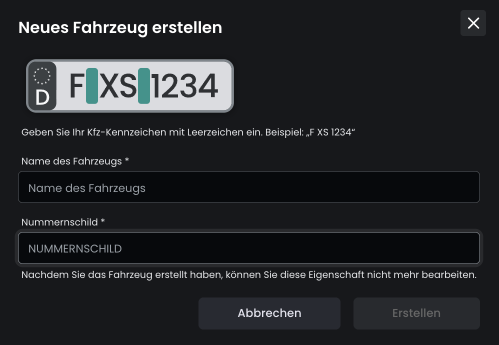 Um ein Auto zu erstellen, müssen Benutzer einen Namen eingeben, der beliebig gewählt werden kann, sowie ein Kennzeichen, das zur besseren Lesbarkeit mit Leerzeichen eingegeben werden sollte.