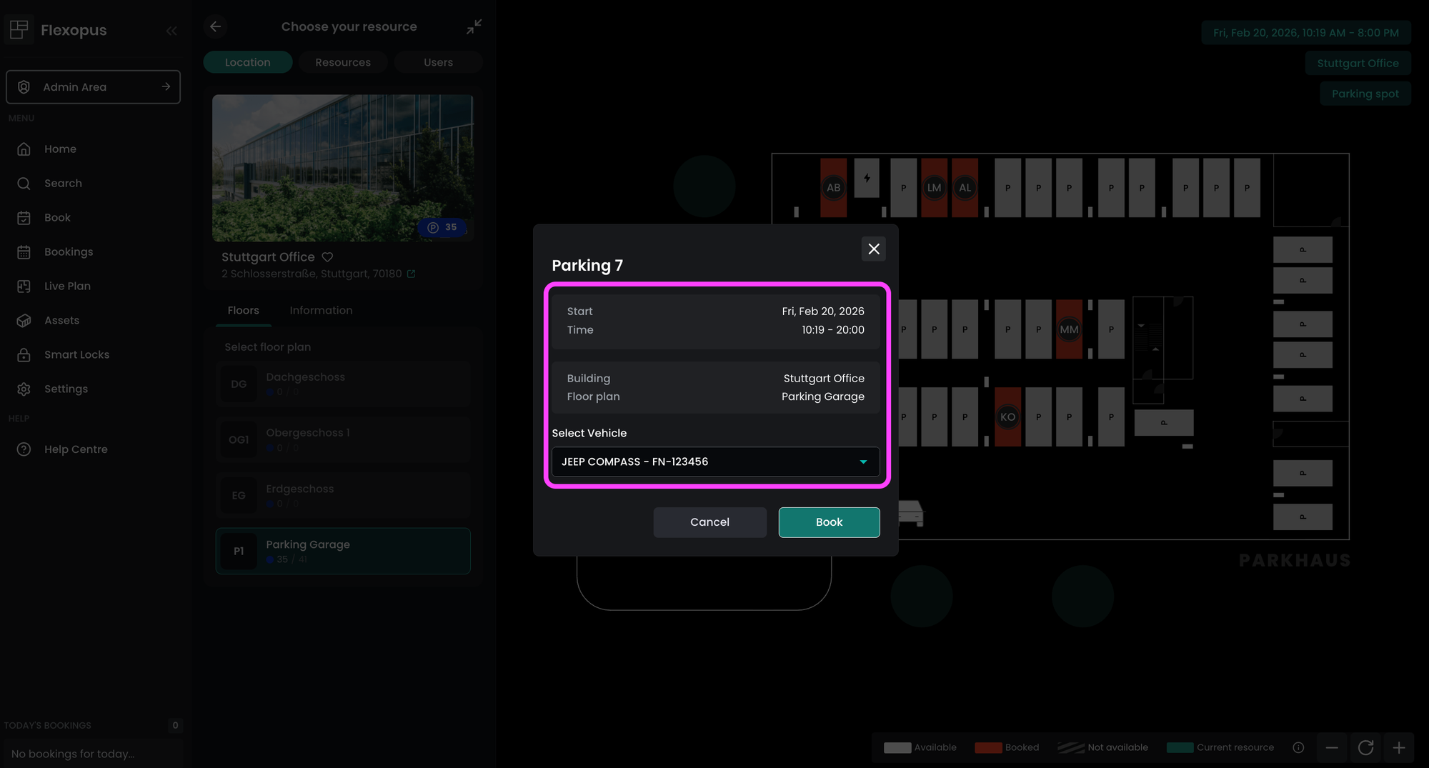 Wenn das Modul aktiviert ist und der Nutzer einen Parkplatz reservieren möchte, fragt das System am Ende des Buchungsvorgangs nach einem Fahrzeug. Nach Auswahl eines Autos kann die Buchung abgeschlossen werden.