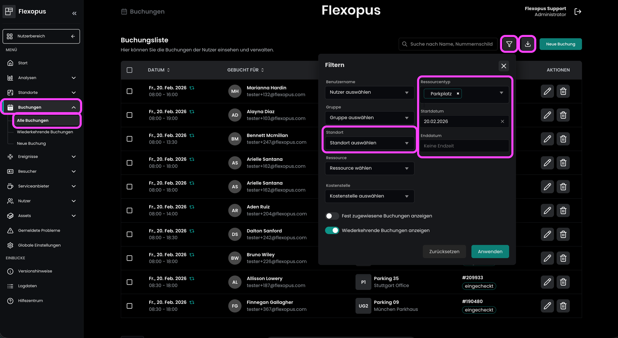 Um zu überprüfen, ob die Parkplätze von den richtigen Nutzern und Fahrzeugen belegt sind, können Sie als Administrator die heutigen Reservierungen exportieren. So geht's:
