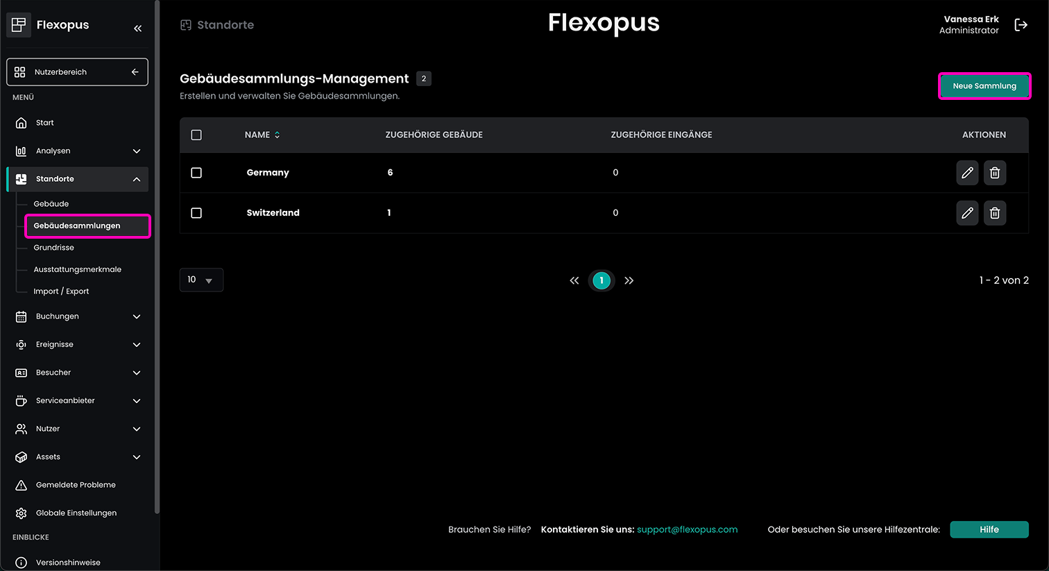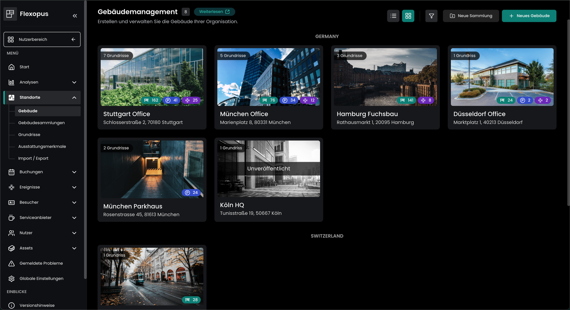 Gebäudesammlungen ermöglichen es Ihnen, mehrere Standorte in logischen Einheiten zusammenzufassen. Dies ist besonders vorteilhaft für internationale Organisationen, die Standorte in verschiedenen Ländern verwalten. Durch die Organisation von Gebäuden in Gruppen erhalten Administratoren eine strukturiertere Übersicht und können die Verwaltung durch erweiterte Filteroptionen optimieren.