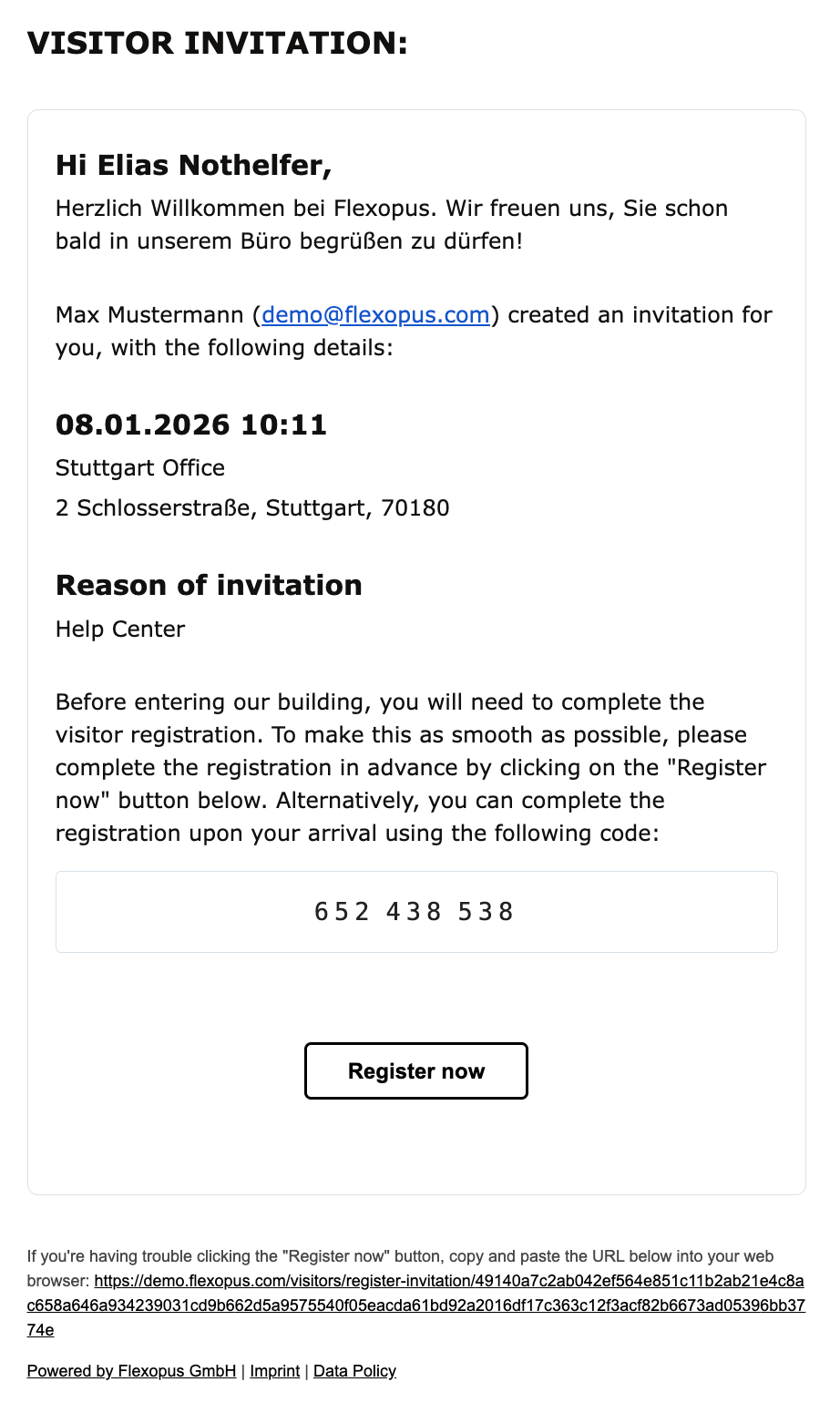 Der typischste Anwendungsfall ist die Einladung eines externen Besuchers in Ihr Büro, wenn Sie dessen Namen und E-Mail-Adresse kennen. In diesem Fall wird der Gast als nicht verifizierter Besucher im System hinzugefügt und erhält eine Einladungs-E-Mail. Über den Link in der E-Mail kann der Besucher vor dem Besuch die Verifizierung abschließen, indem er die erforderlichen Informationen ausfüllt und die bereitgestellten Besucherdokumente akzeptiert.