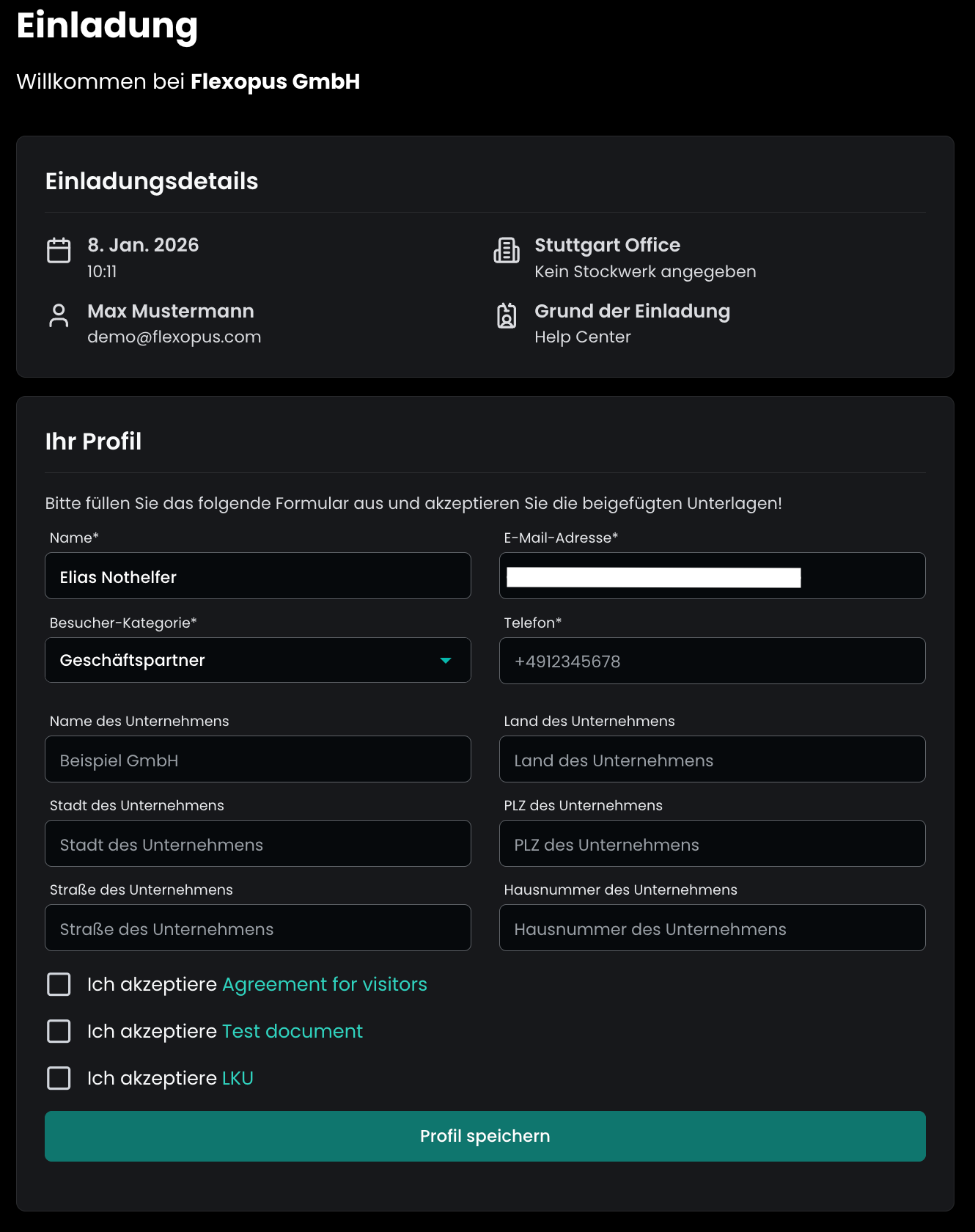 - Erstellung eines Besucherprofils: Erfordert mindestens den Namen und die E-Mail-Adresse des Besuchers. Je nach den administrativen Einstellungen können zusätzliche Angaben wie Firmenname oder Telefonnummer erforderlich sein.