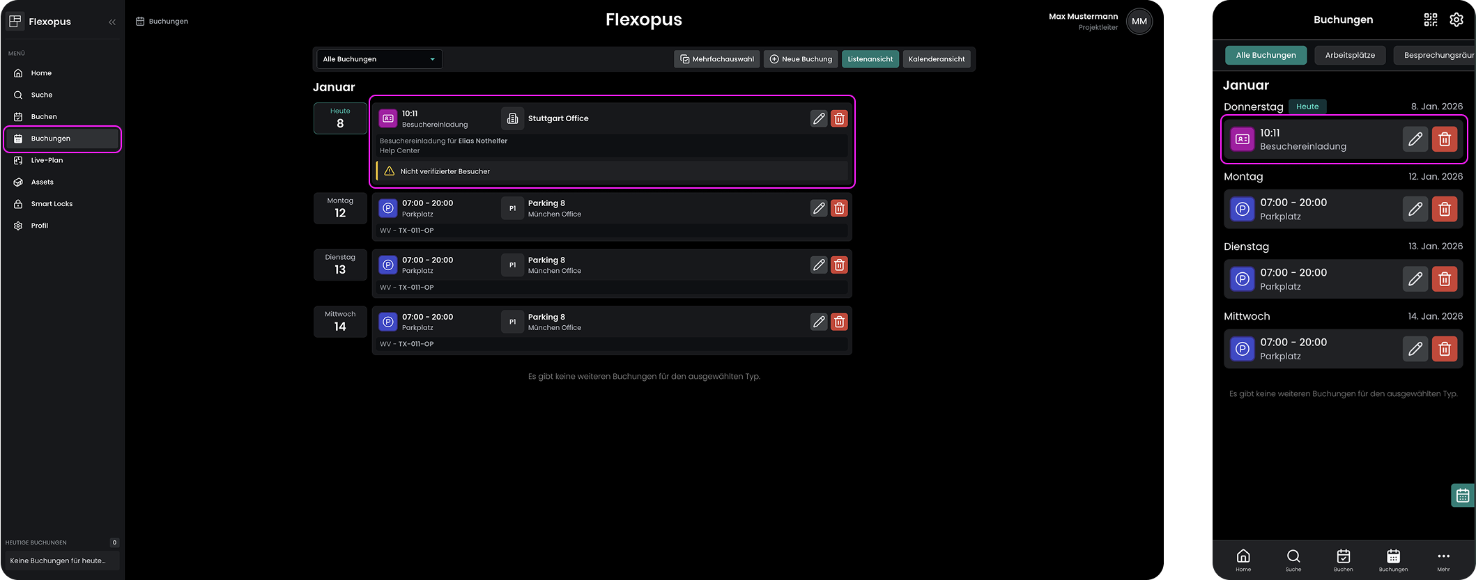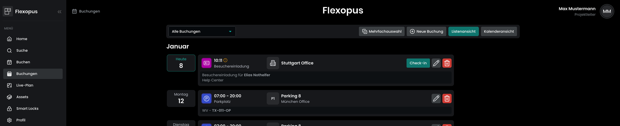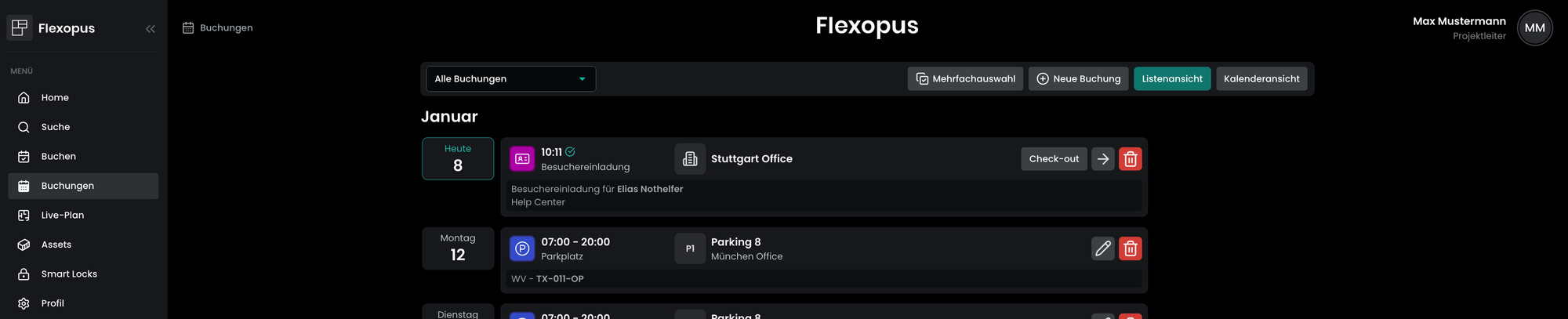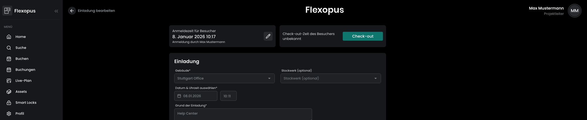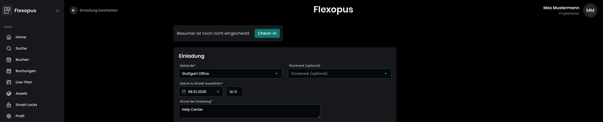 - Dokumentieren Sie den Besuch: Nach der Überprüfung durch den Gastgeber kann das ausgefüllte Profil des Besuchers in Flexopus als offizieller Besuch erfasst werden, wodurch genaue Aufzeichnungen und die Einhaltung der Sicherheitsvorschriften im Büro gewährleistet sind.