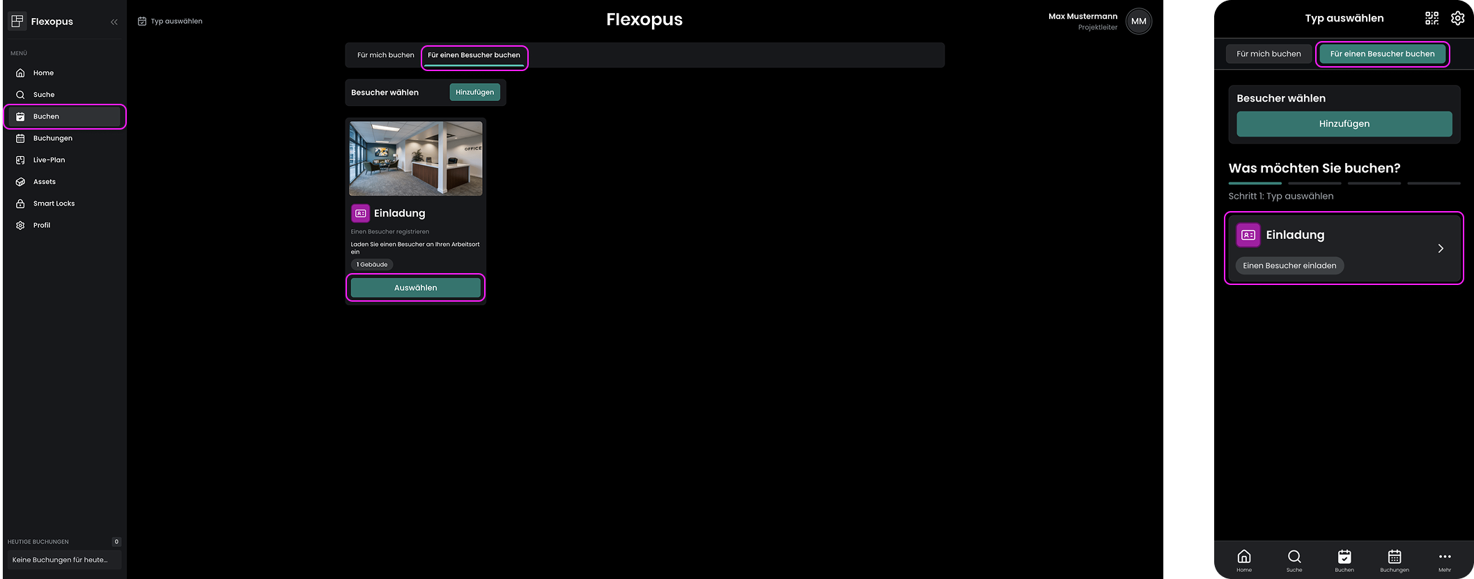 Buchen>Für einen Besucher buchen>Einladung. - Registrieren Sie den Besucher: Befolgen Sie die Anweisungen, um die Daten des Besuchers einzugeben und den Registrierungsvorgang abzuschließen.