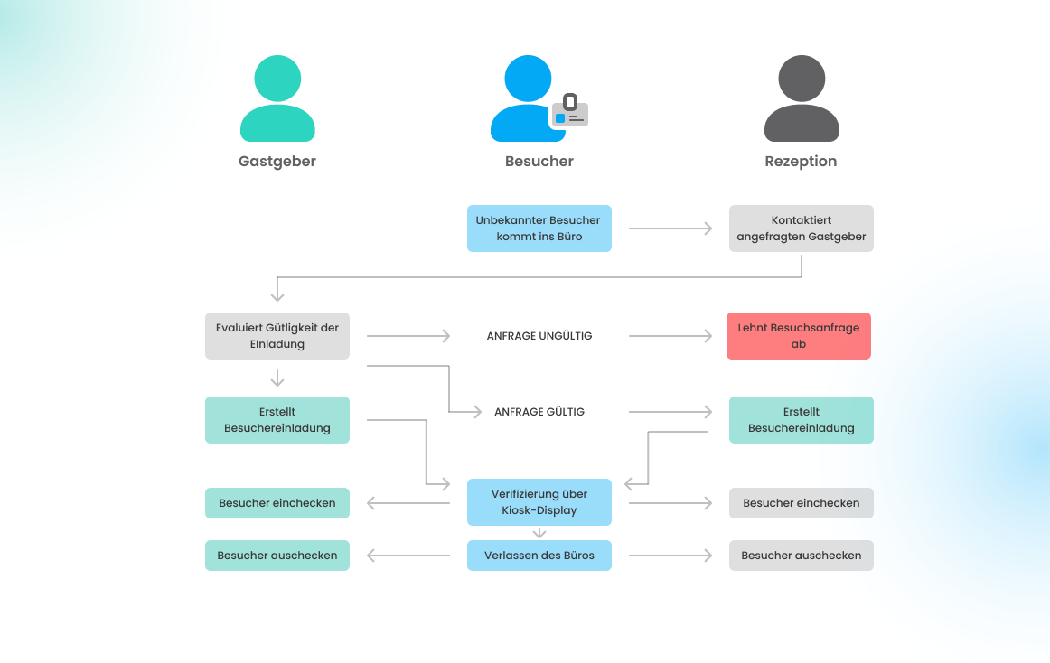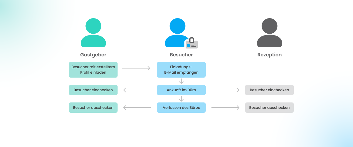 Mit dem Besuchermanagement-Modul können Sie bei der Einladung eines Besuchers die folgenden Anwendungsfälle abdecken: