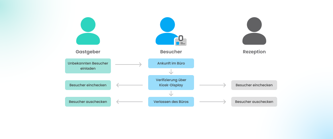 Mit dem Besuchermanagement-Modul können externe Gäste als Besucher registriert werden, wodurch ein strukturierter Zugangsprozess gewährleistet wird. Die Schritte umfassen: