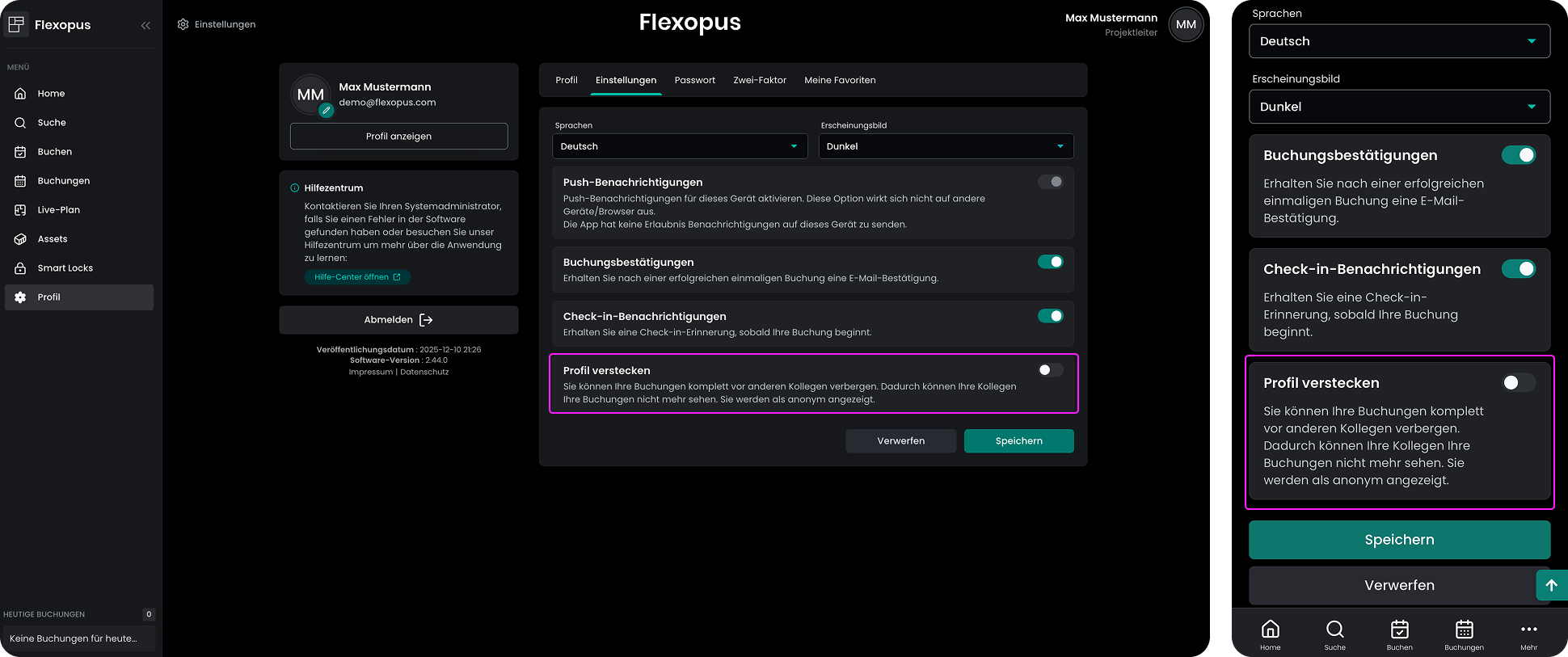 In einigen Fällen beschließt die Personalabteilung oder der Betriebsrat jedoch, diese Einstellung einzuschränken und den Benutzern die Möglichkeit zu geben, ihre Buchungen und ihre Anwesenheit im Büro zu verbergen. Wenn Sie aufgrund der von den Administratoren konfigurierten globalen Datenschutzeinstellungen über die Sichtbarkeit Ihres Profils entscheiden können, finden Sie die Einstellung in den Profileinstellungen > Registerkarte Einstellungen unter Profil verbergen.