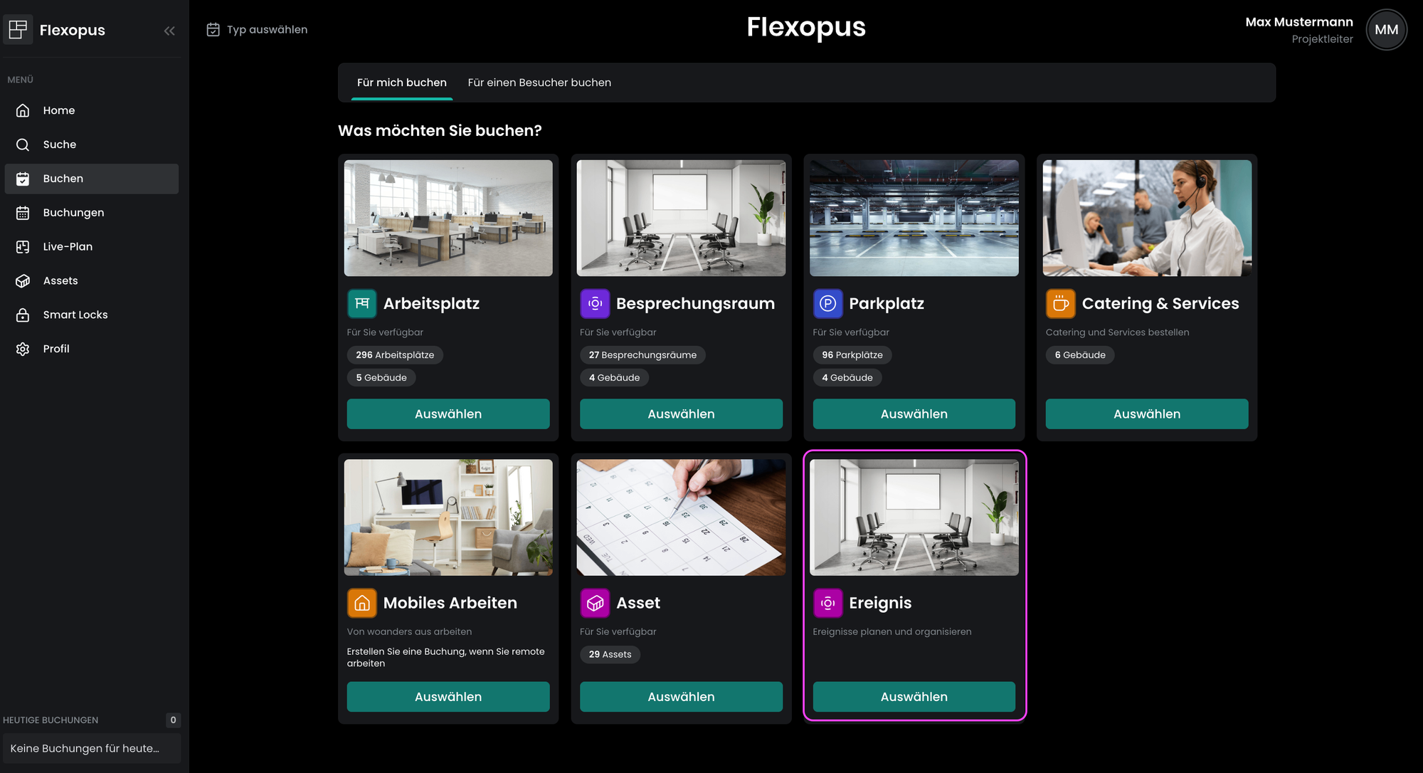 Sobald Ihr Unternehmen das Event Management aktiviert hat, wird auf der Buchungsseite eine neue Kachel hinzugefügt.