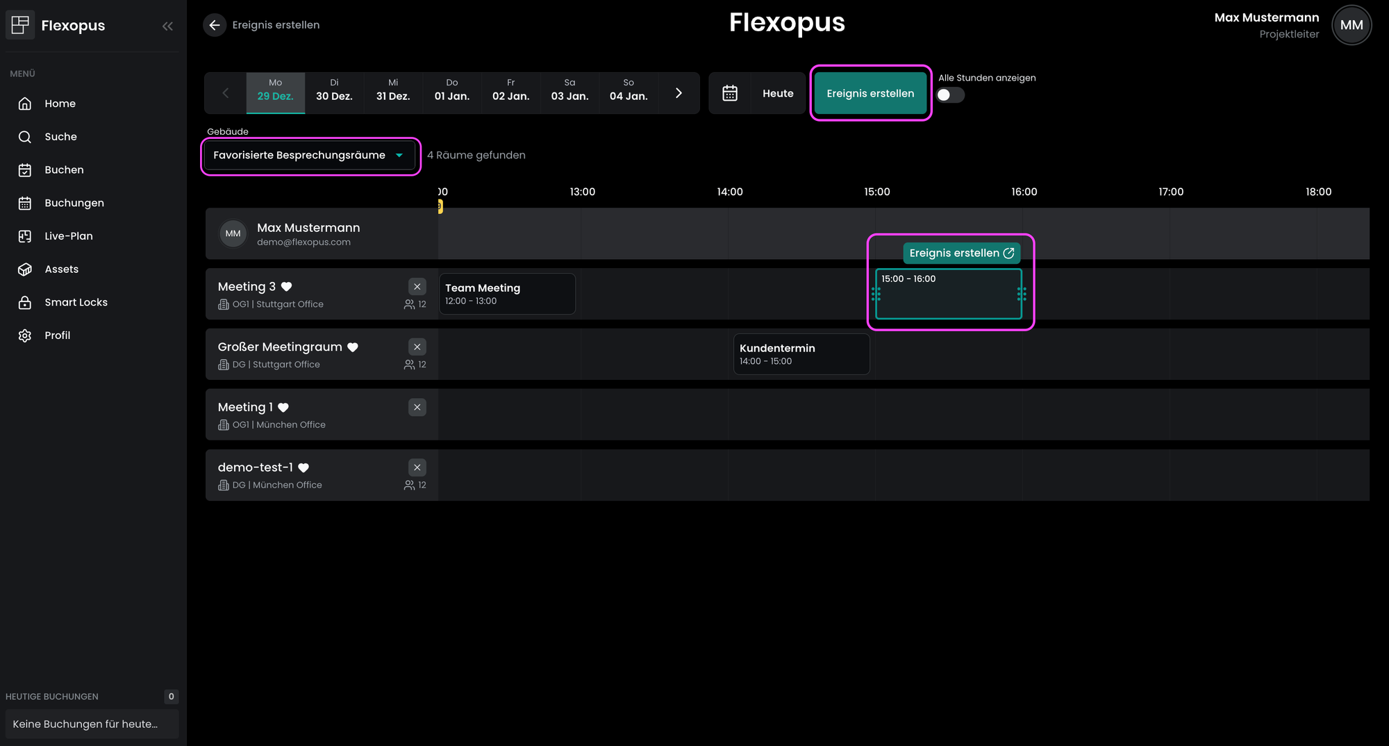 Sobald Sie darauf klicken, gelangen Sie zur Ereignisplanungsübersicht, wo Sie alle Ihre bevorzugten Besprechungsräume sehen oder nach Standort filtern können. Sie sehen sofort die Belegung dieser Räume und können sich direkt für einen Raum entscheiden, der Ihren Anforderungen entspricht.