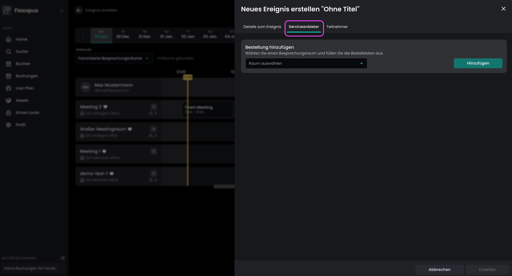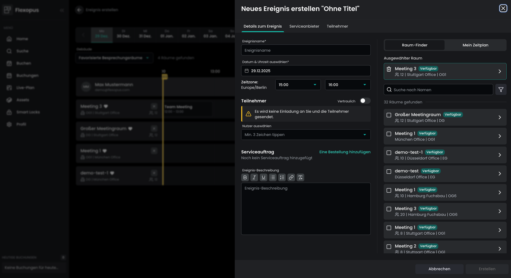 Das Event Management ist eine erweiterte Lösung für die Raumbuchung und bietet Optionen wie das Einladen von Teilnehmern, das Buchen mehrerer Räume, das Hinzufügen einer Beschreibung und optional das Hinzufügen von Catering- und Servicepositionen.