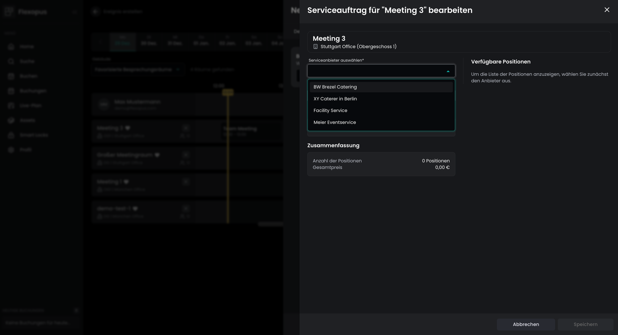 Wenn Sie auch unsere Catering- und Servicefunktion nutzen, haben Sie die Möglichkeit, Ihrem Ereignis sofort einen Serviceauftrag hinzuzufügen. Dies könnte beispielsweise die Anweisung an den Facility Manager sein, die Sitzplätze auf eine bestimmte Weise anzuordnen, oder eine Bestellung bei dem Caterer aufzugeben, der für die Verpflegung der Veranstaltung zuständig ist.