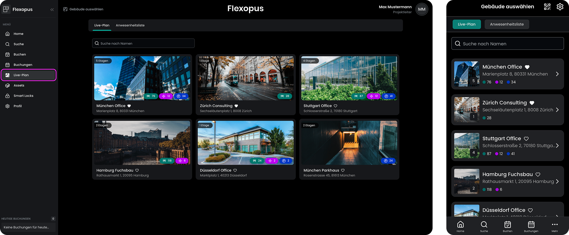 Klicken Sie im Menü auf der linken Seite der Flexopus-Anwendung auf Live-Plan und wählen Sie das gewünschte Gebäude und die Karte aus, um anzuzeigen, wer an einem bestimmten Tag in ein bestimmtes Gebäude und auf eine bestimmte Etage kommt.