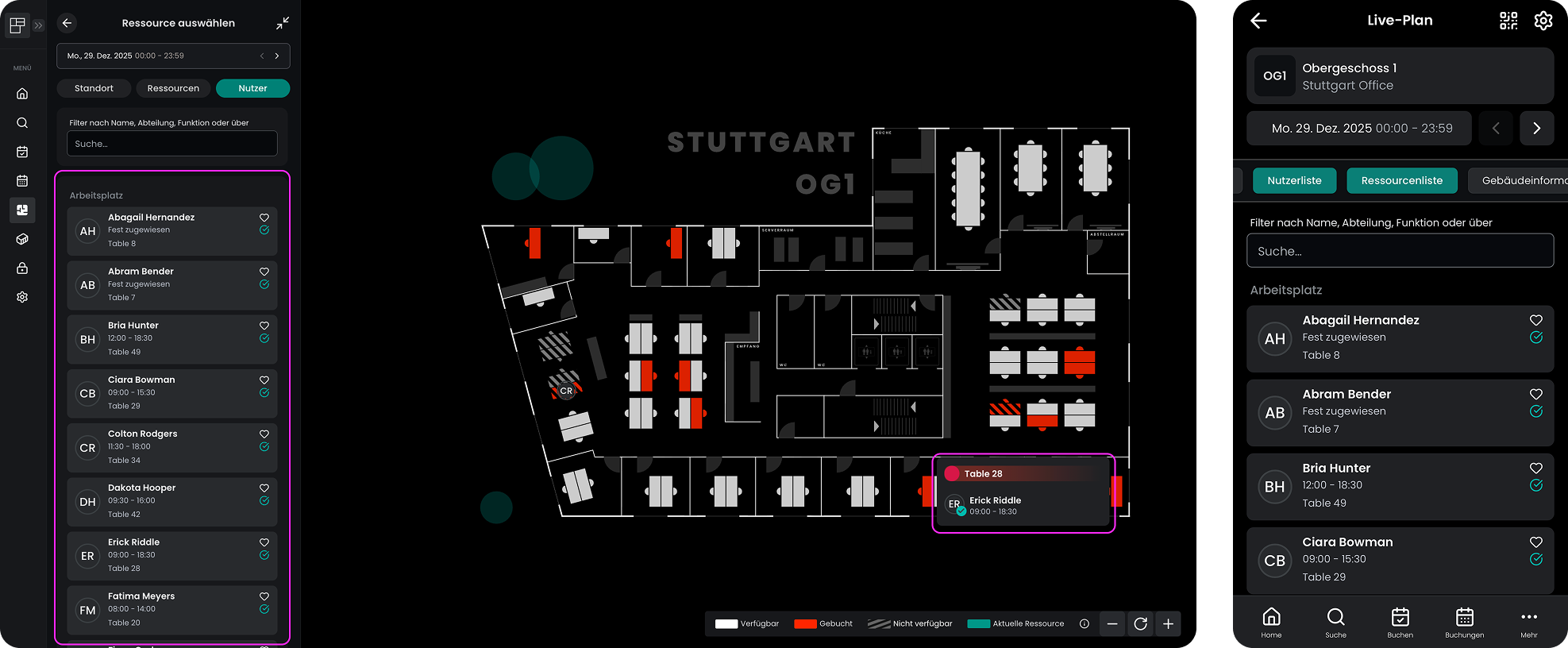 Sie können auch die Benutzerfilteroption verwenden, um einen bestimmten Benutzer zu finden. Der Filter gilt für die Felder Name, E-Mail, Funktion, Abteilung und Über mich. Nach Anwendung der Filter werden nur die Reservierungen der gefilterten Benutzer auf dem Grundriss angezeigt. Wenn Sie mit der Maus über den Benutzer fahren, wird der entsprechende Schreibtisch auf dem Grundriss hervorgehoben.