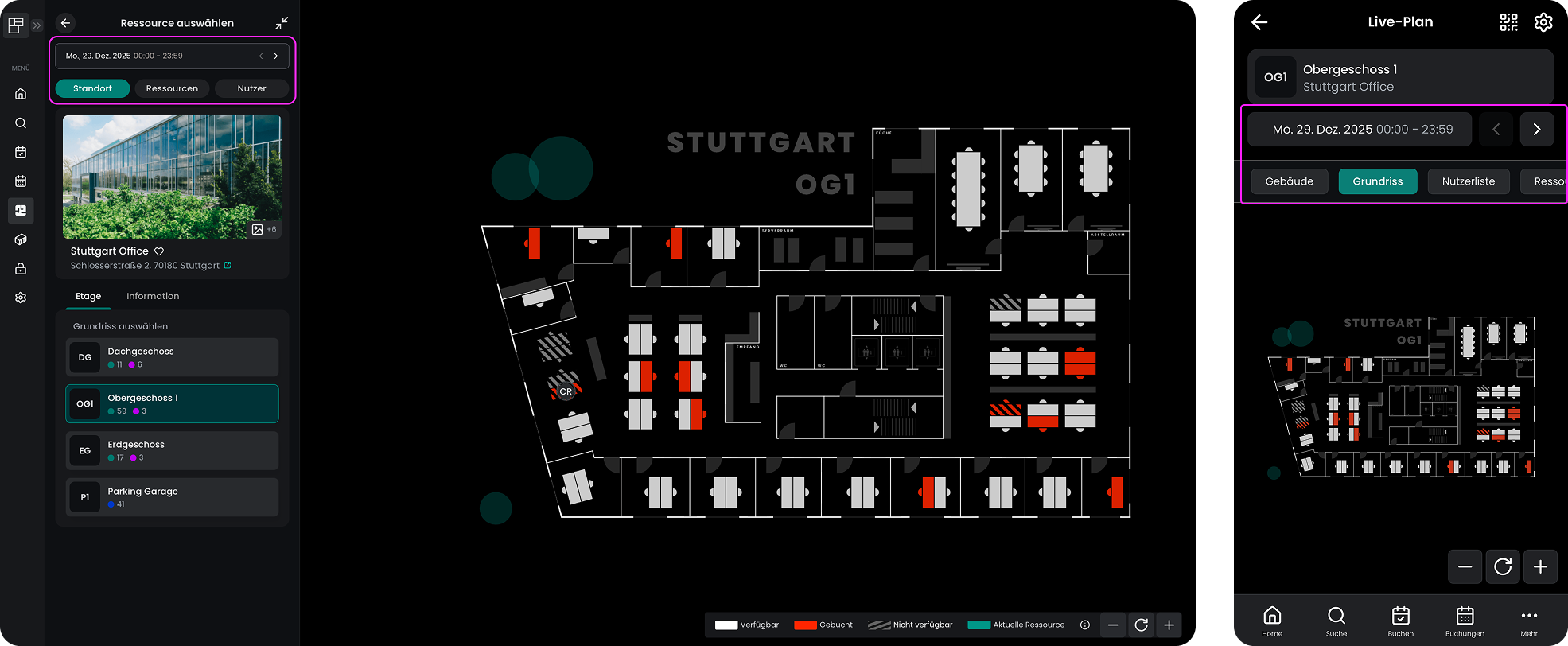 Wenn Sie auf das Datum und die Uhrzeit in der Live-Karte klicken, öffnet sich ein Pop-up-Fenster. Mit den Pfeilen können Sie durch vergangene oder zukünftige Daten navigieren und jederzeit den Belegungsstatus des Grundrisses überprüfen.