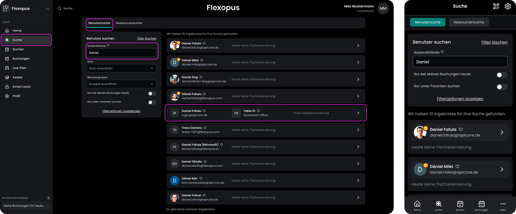 Navigieren Sie als Benutzer zur Registerkarte Suche und wählen Sie die Registerkarte Benutzersuche aus. Hier können Sie nach Kollegen innerhalb Ihres Unternehmens suchen und sehen, wer heute im Büro ist. Falls der Benutzer für heute eine aktive oder bevorstehende Reservierung für einen Arbeitsplatz oder ein Homeoffice hat, wird dies neben dem Benutzer angezeigt. So können Sie einen bestimmten Kollegen leicht finden.