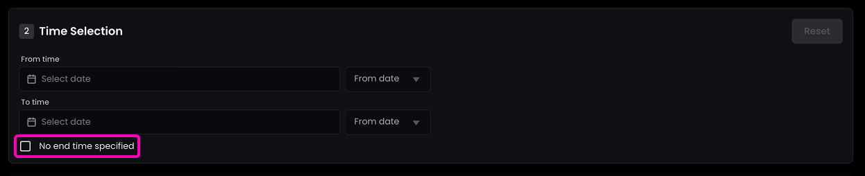 To permanently assign an asset to a user, follow the booking process that was previously described. The only thing that needs to be taken care of is to tick the checkbox No end time specified to make sure that the chosen asset will always be assigned to the specified user unless an admin changes that.