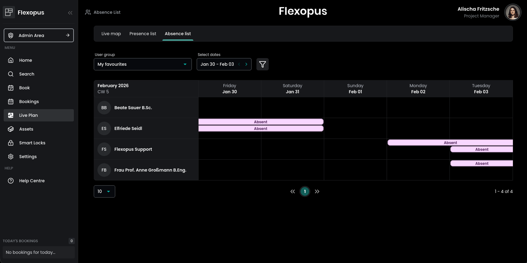Flexopus now offers an HRIS integration that provides users with better visibility into absences within their organization. In the user area, it is now clearly visible which favorite colleagues (if the Favorites feature is enabled) and which members of a user’s groups are currently absent. For privacy reasons, the specific reason for an absence is not displayed.