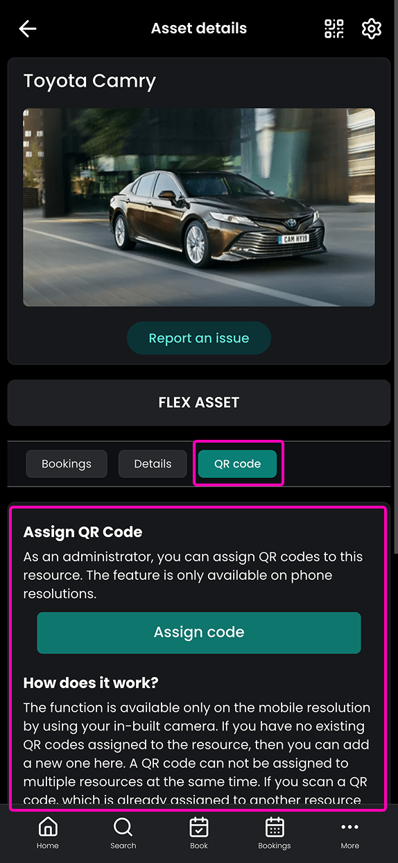 Users can scan the QR code to view asset details, directly create a booking, and check-in (if enabled).