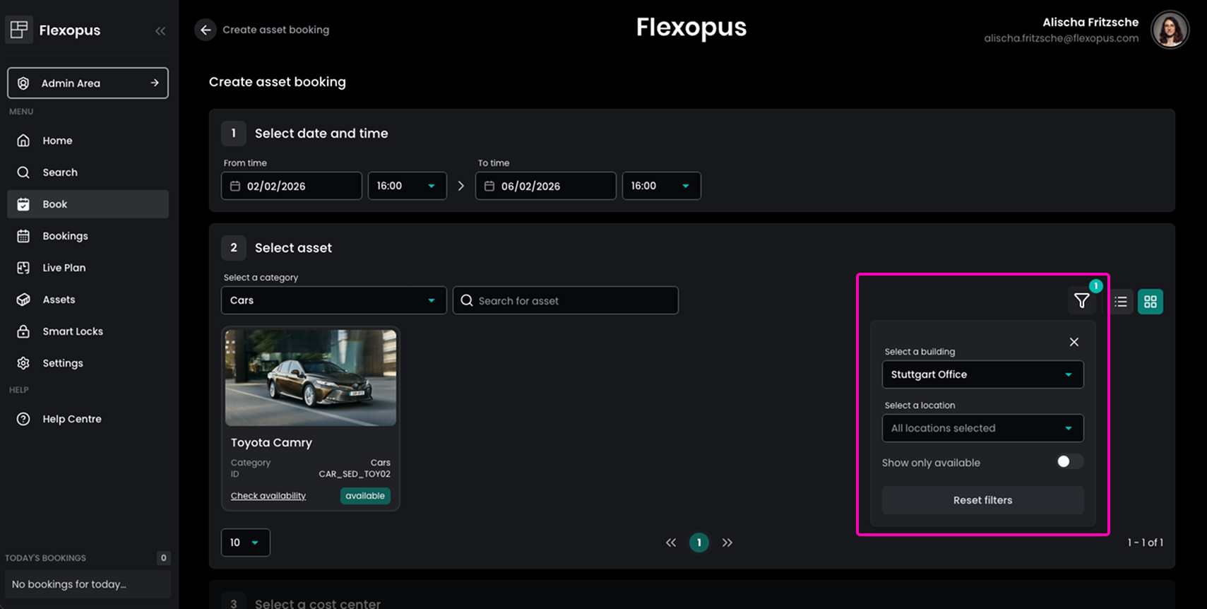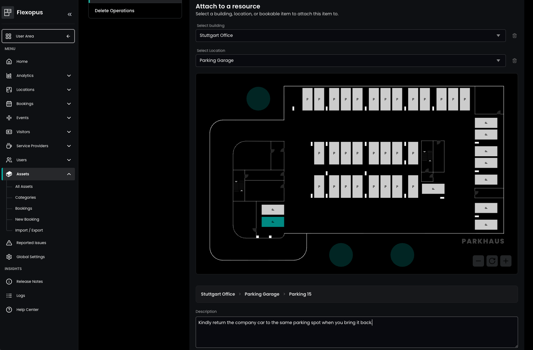 Administrators can now assign assets to a specific building, location, and even to a concrete resource. This makes it easier for users to find assets at the right location during the booking process and to know exactly where an asset can be picked up after booking.