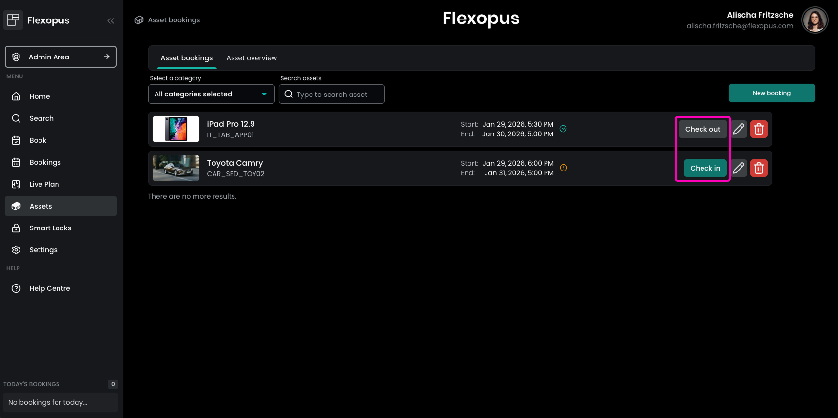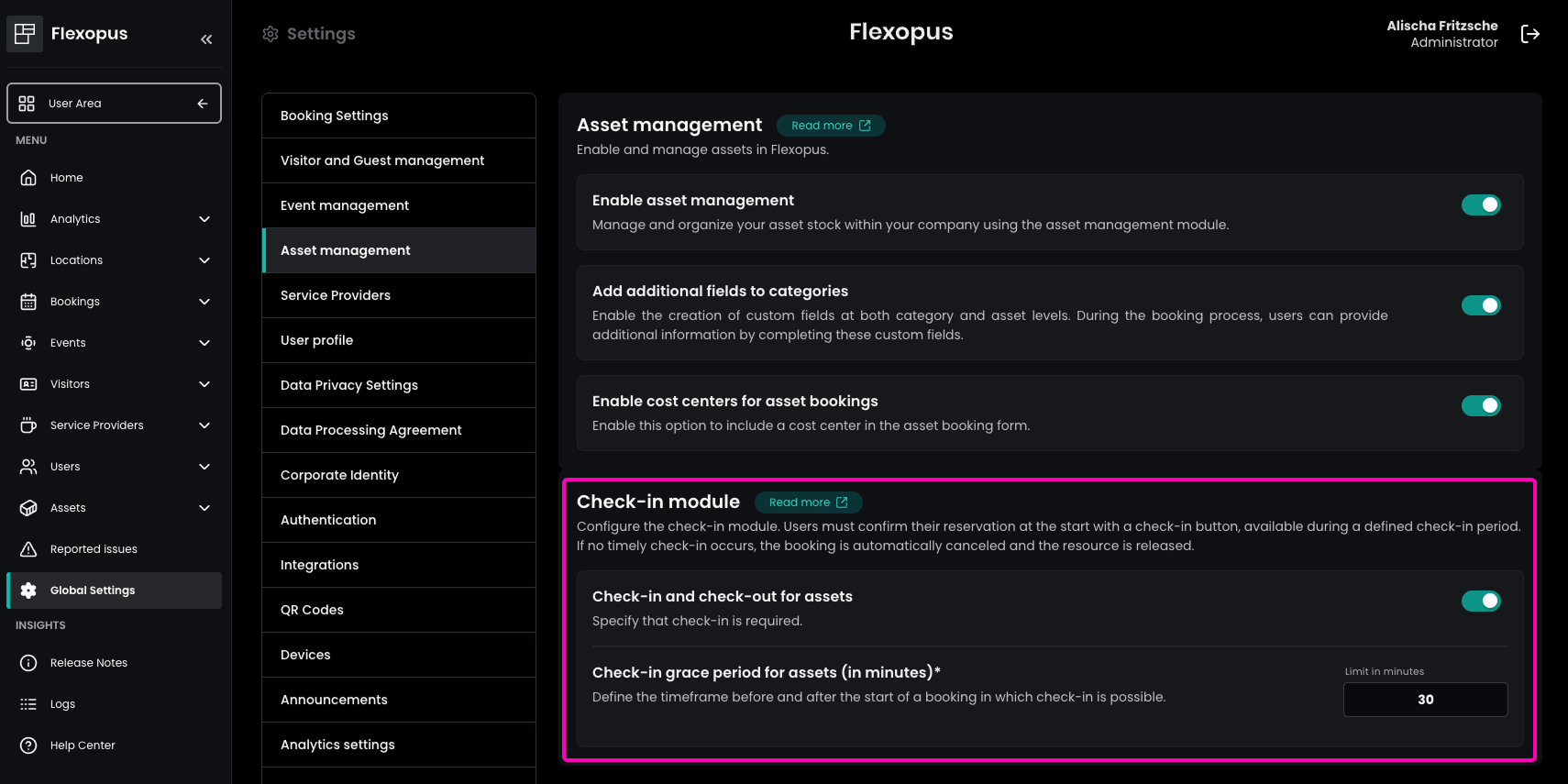 Assets can now be checked in, similar to the existing check-in functionality for workspaces, meeting rooms, and parking spaces. To enable this feature, administrators can activate asset check-in in the Admin Area under Global Settings → Asset Management and define a grace period.