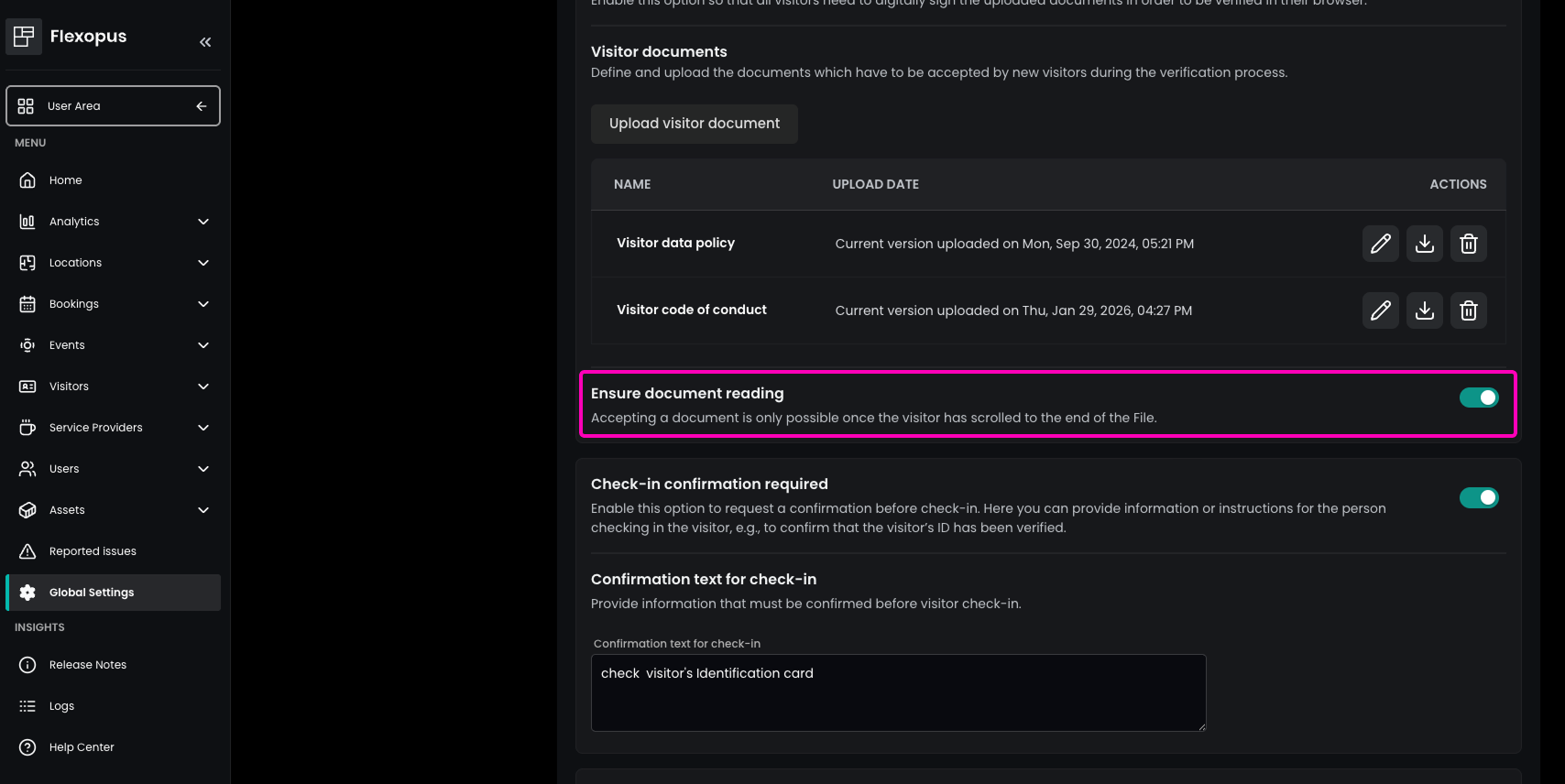 Administrators can now ensure that visitors actually read required documents before completing registration. This option can be enabled in the Admin Area under Global Settings → Visitor and Guest Management → Visitor Management by activating Ensure document reading.