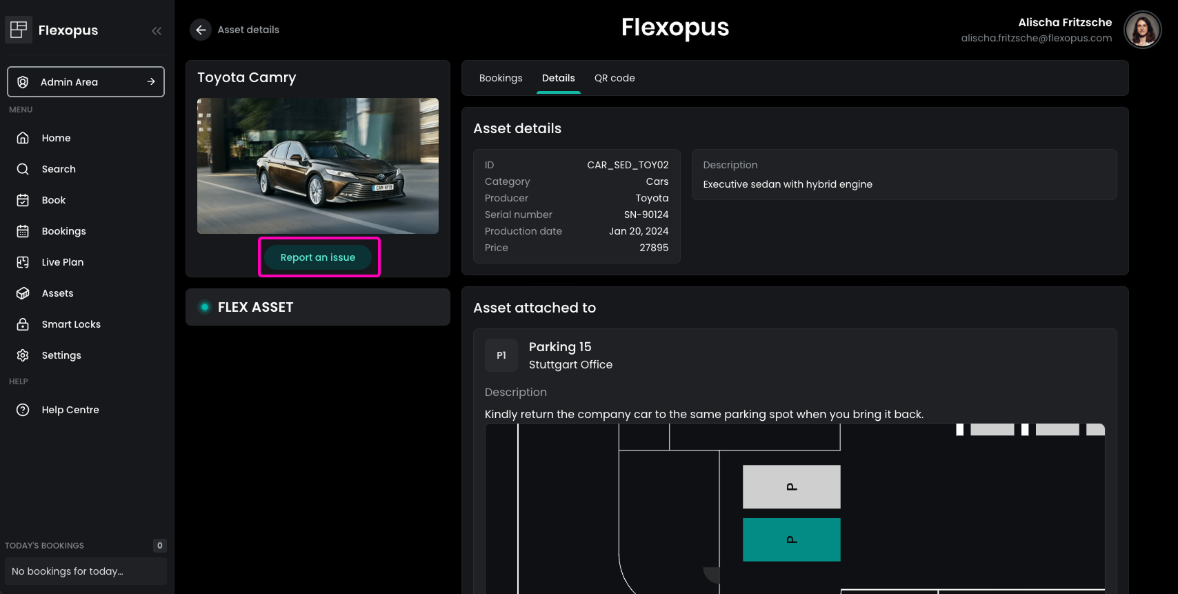 The Issue Reporting feature, already known from workspaces, meeting rooms, and parking spaces, is now also available for assets. It can be activated in the Admin Area under Global Settings → Booking Settings → Issue Reporting.