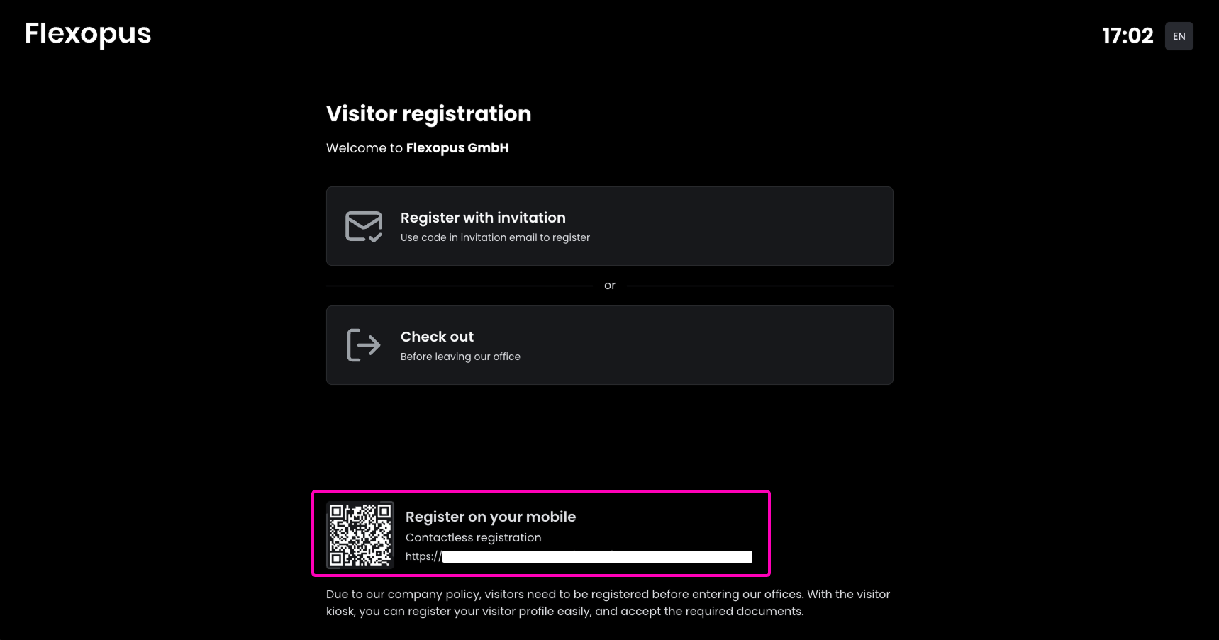 Visitors can now check in contactlessly by scanning a QR code displayed on the Visitor Kiosk. This opens a temporary guest session on their smartphone after scanning the QR code shown on the Visitor Kiosk, allowing them to complete the registration process without touching the kiosk. The session stays active for 10 minutes or 10 requests and can be renewed by rescanning the QR code. For badge printing and checkout, interaction with the kiosk is still required.