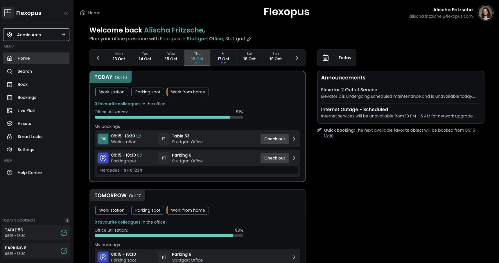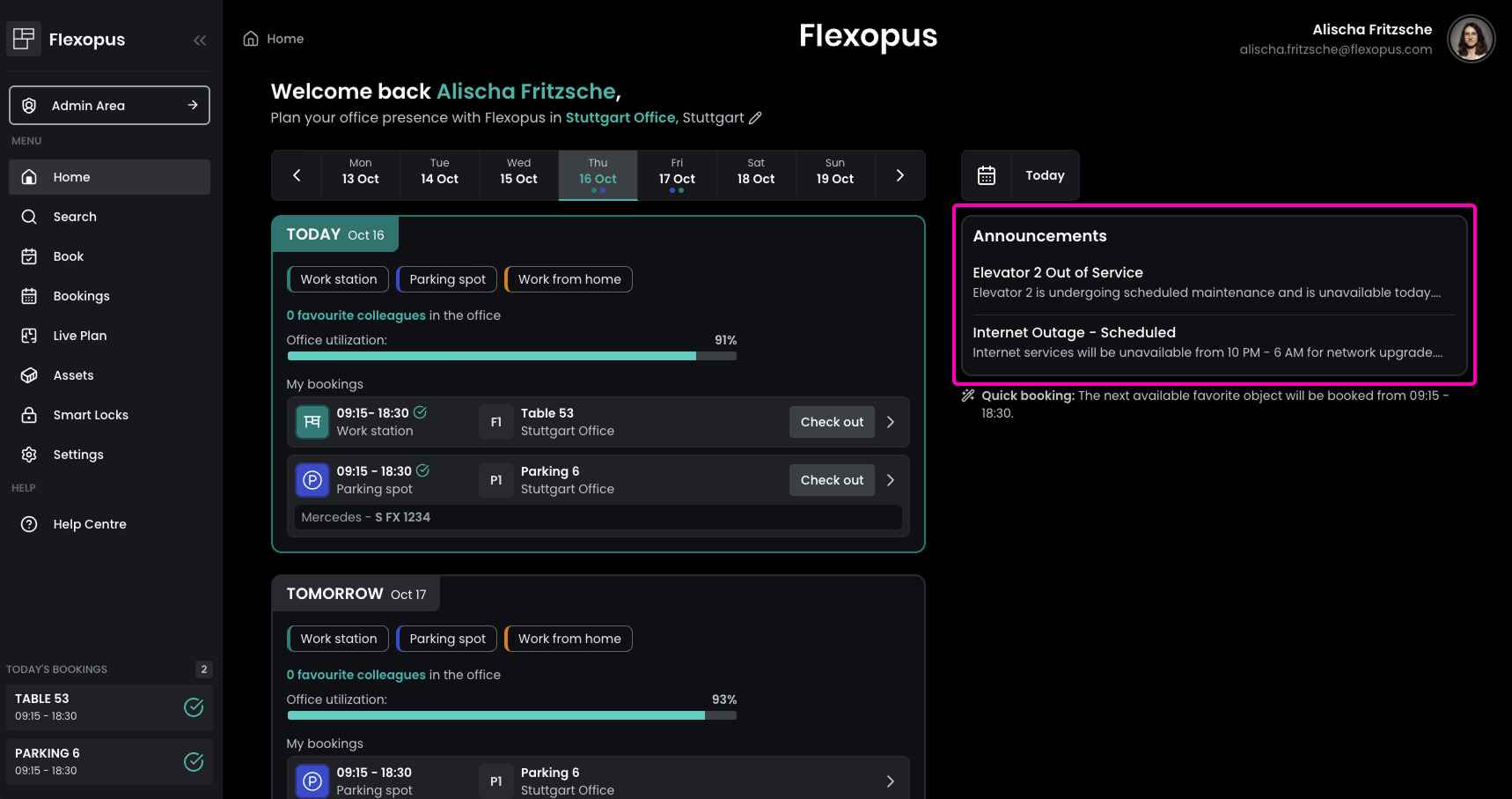 The new Home Screen provides users with an overview of their upcoming bookings, shows how many workspaces are already booked, helping them quickly decide whether to reserve a workspace before availability runs out. Additionally, the Home Screen allows users to perform one-click bookings for workspaces, parking spots, and Home Office. By clicking the magic wand icon next to the buttons, users can instantly book one of their favorited resources for the selected day. Announcements from favorited buildings are also displayed on the Home Screen, keeping users up to date with relevant news.