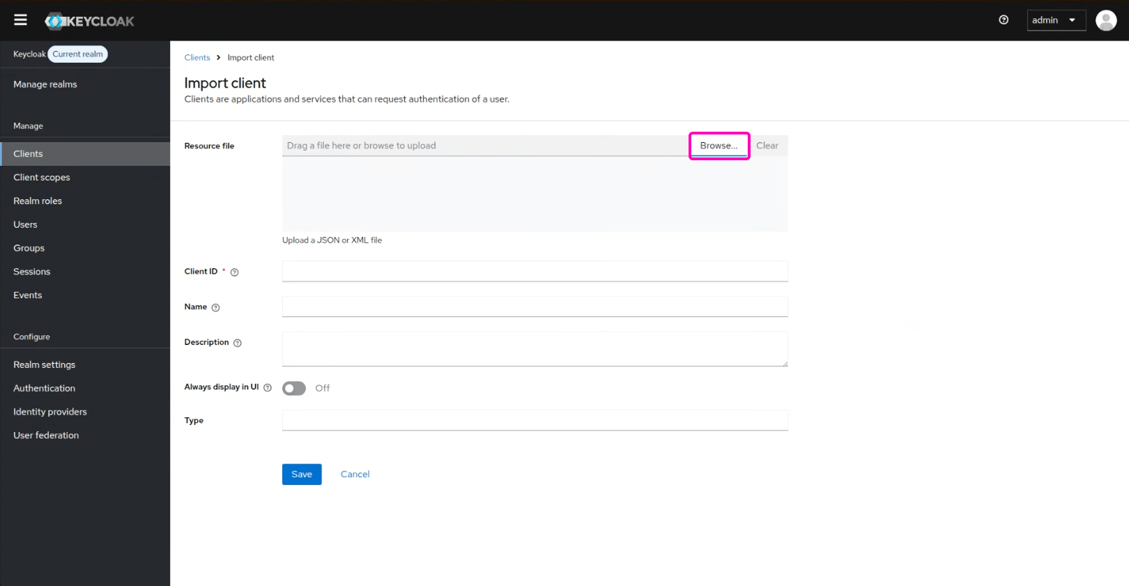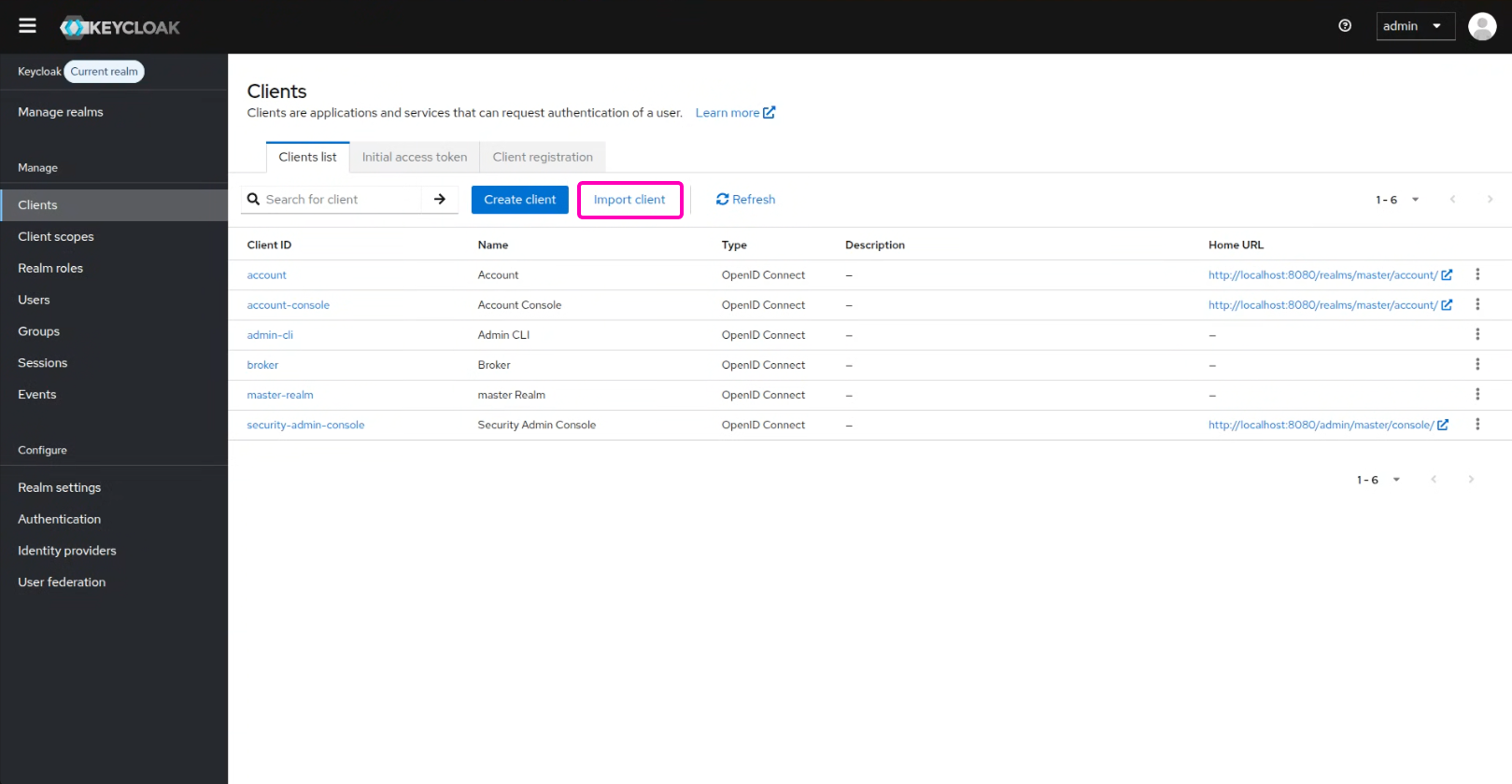 Go to your KeyCloak admin console in KeyCloak and select Clients > Import client.