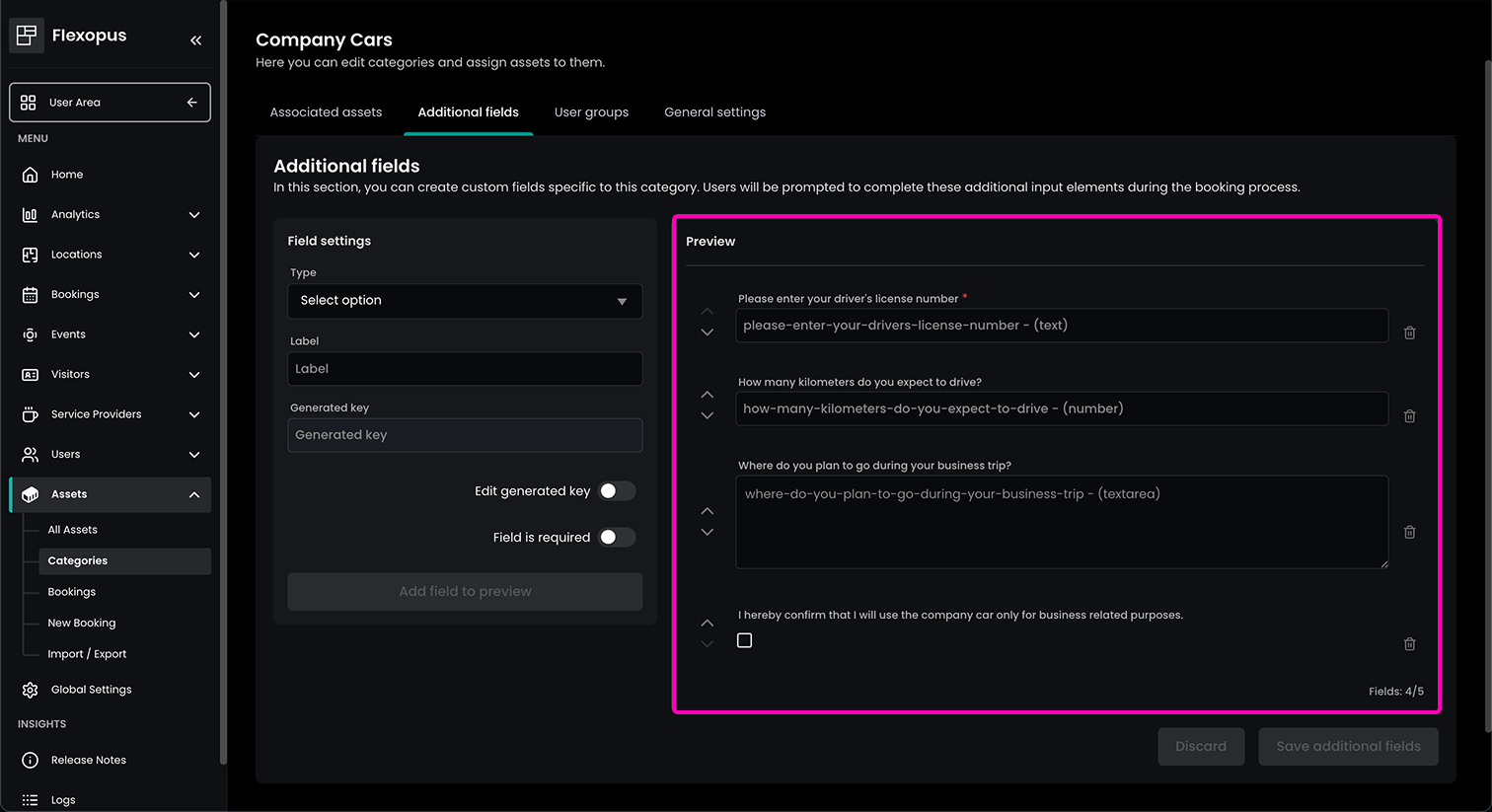 You can define up to 5 additional fields for each category that will be shown during the booking process of an asset of that category. For example, you can define input fields to have users enter their driver's license number when booking a company car, or you can add a checkbox to make sure users read a specific note before confirming a booking. Adding additional fields first needs to be activated in the global settings of the asset management under Global Settings > Asset management > Add additional fields to categories. The additional fields have the following settings: