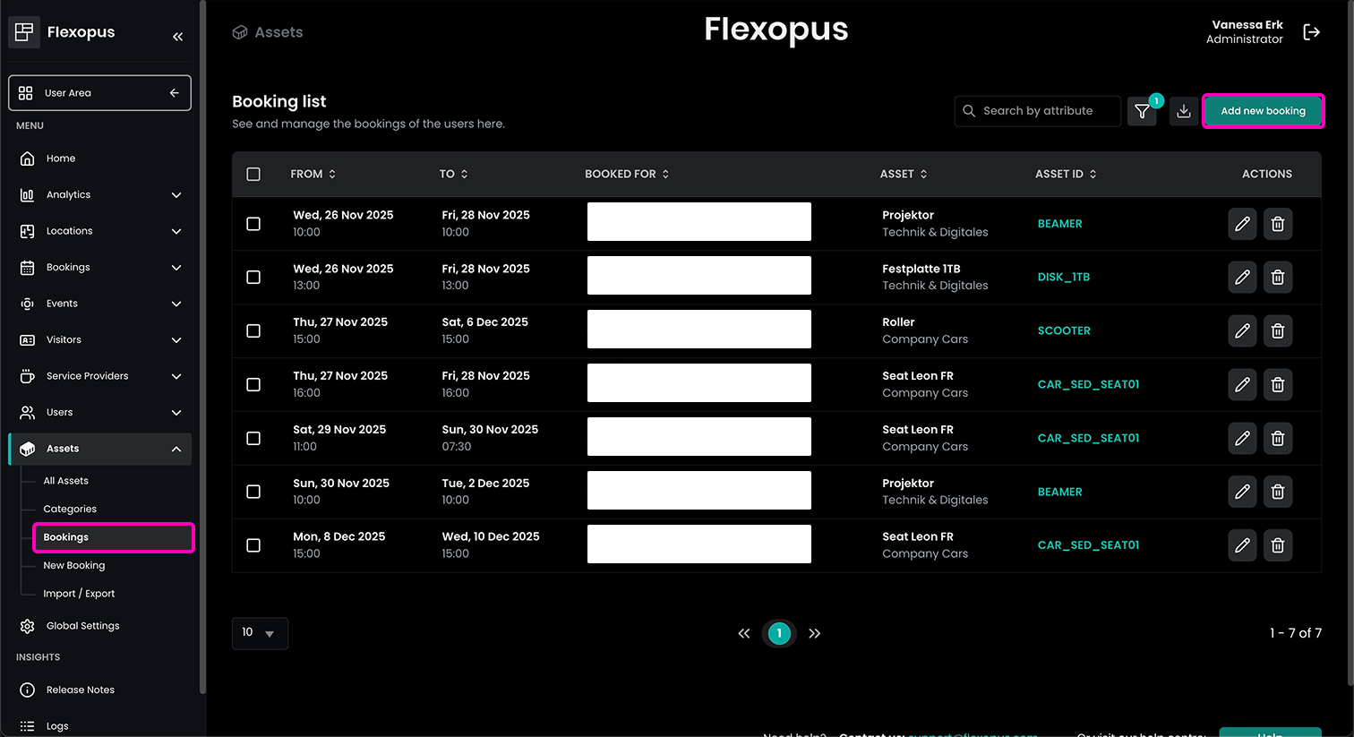 In the bookings overview, you can see all upcoming asset reservations and also edit and delete them. You can also immediately create a new booking from here by clicking on the green button Add new booking.