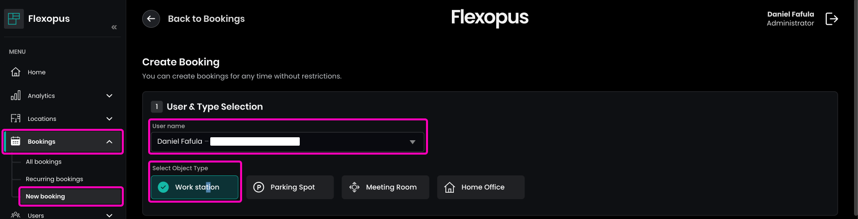 As an administrator in Flexopus, navigate to Dashboard > Bookings > New Booking. In the first step, select the user. Then, choose the type of booking you want to create, such as a workstation, parking spot, or meeting room.