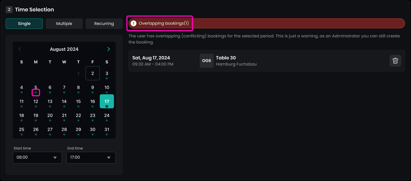 In the calendar, dots show which days the user already has a booking for the selected resource type. Conflicts for the chosen dates appear on the right side. You can delete these bookings directly if needed, or leave them and create new bookings alongside the existing ones.