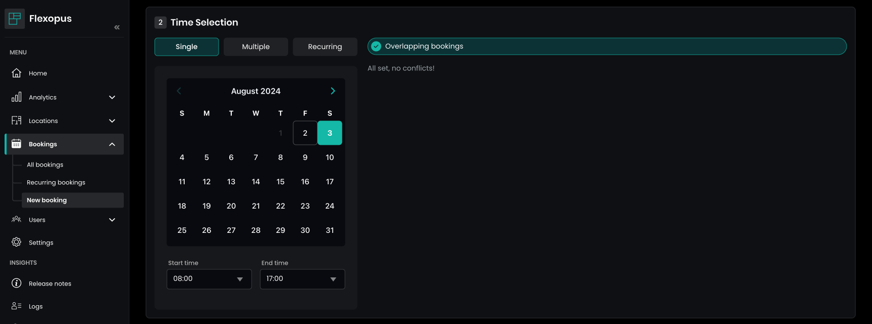 Flexopus will automatically check if the user has any overlapping reservations for the selected dates. As an administrator, it's important to be aware of existing bookings within the selected time frame. However, you have the option to ignore these overlaps and proceed with creating a new booking for the user if needed.