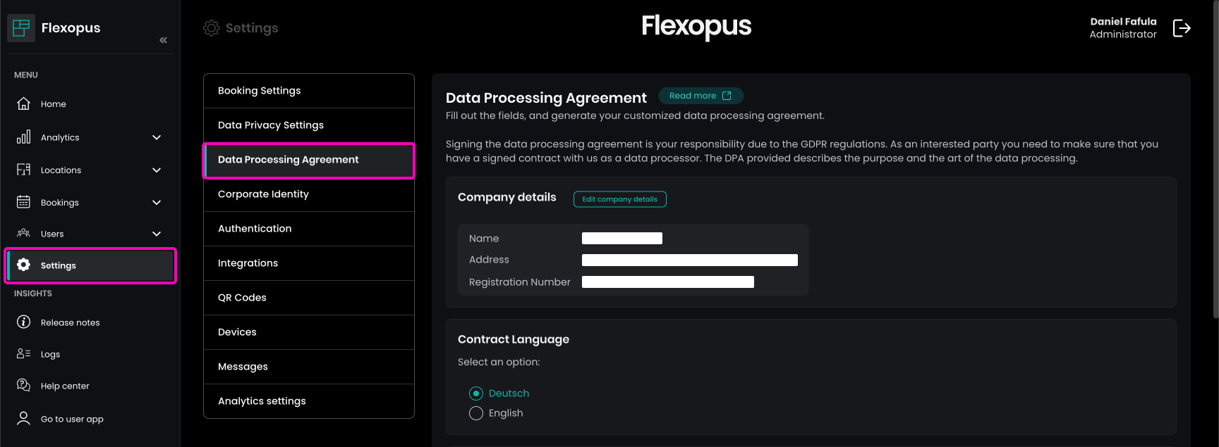 - Navigate as an administrator to Dashboard > Settings > Data Processing Agreement.