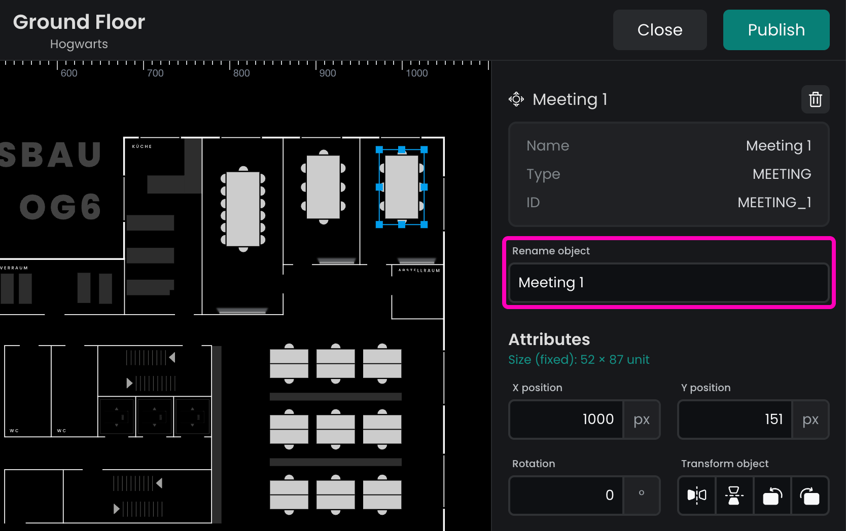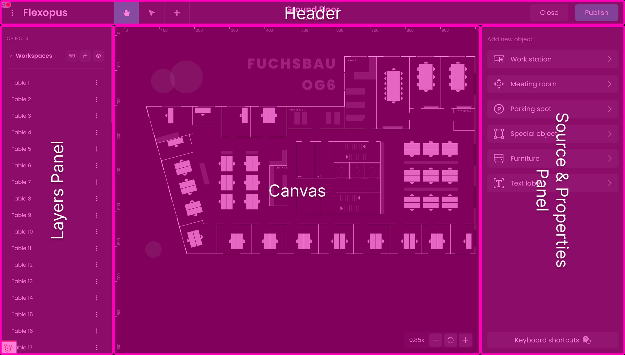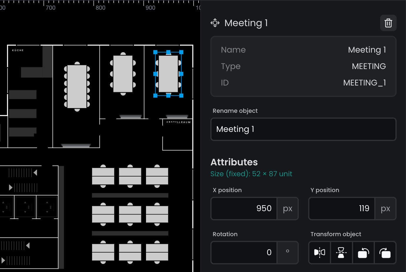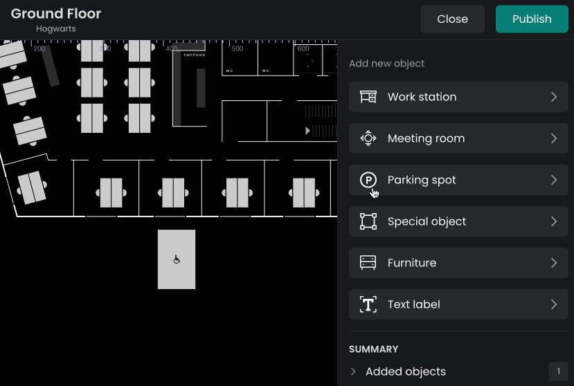 Flexopus maps are stored in SVG format, using a custom scheme for representing static and bookable resources. You can download your floor plan from the Floorplanner and make changes to it in your preferred SVG editor tool. Once you made your changes send the updated plan to support@flexopus.com and our colleagues will upload it for you. All plans will be manually evaluated to match the Flexopus Plan Scheme, ensuring no mistakes are made.
