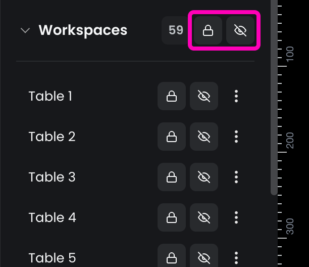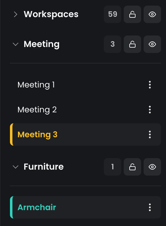 The left panel contains all the layers of the application, with editable resources grouped by type into layers such as Workspaces or Furniture. You can expand or collapse these groups to organize the space more efficiently.