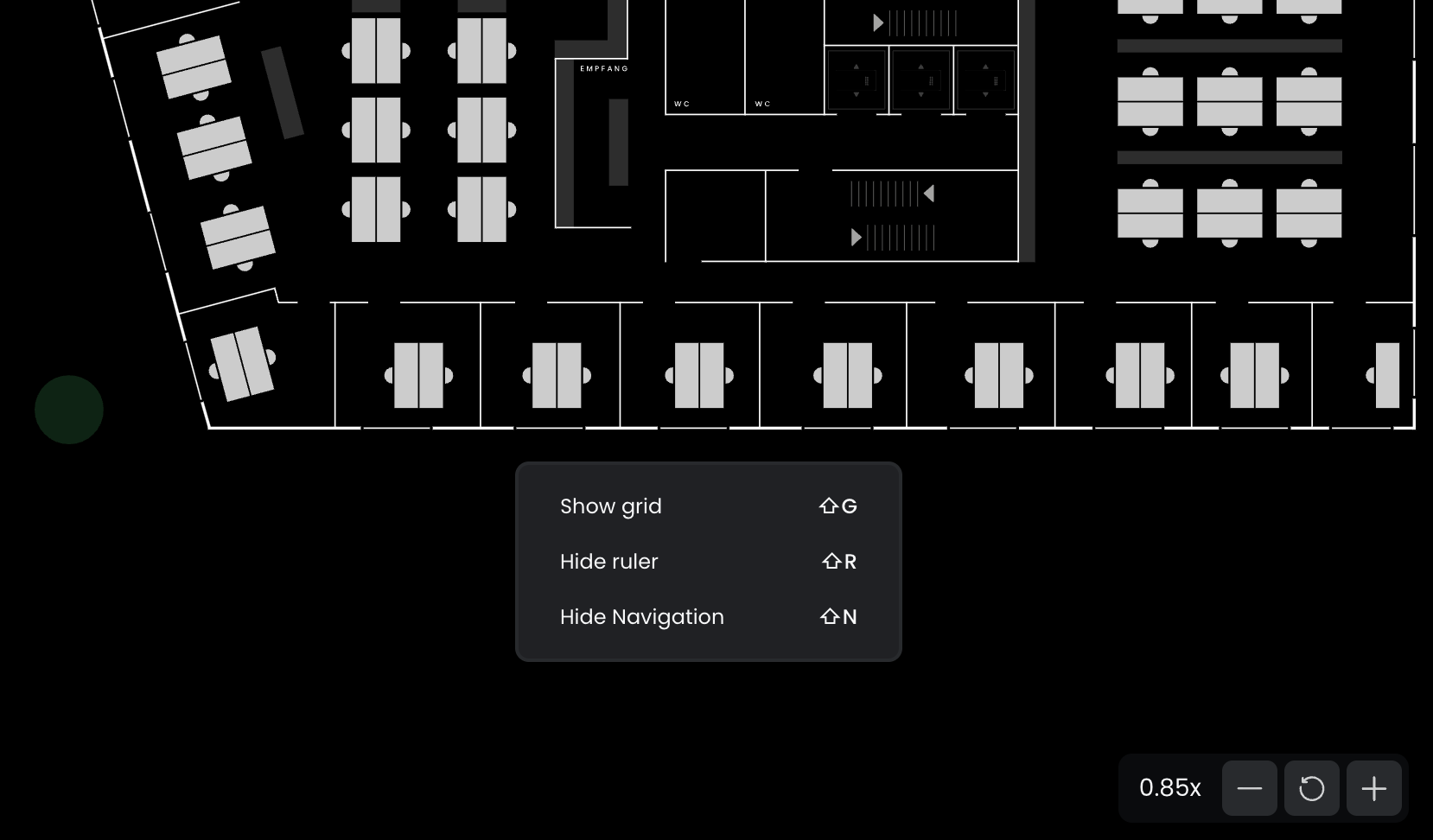 To access global actions in the Floorplanner, use the Options menu (⋮) located in the left corner. Some actions are only available in the dropdown, or via shortcuts.