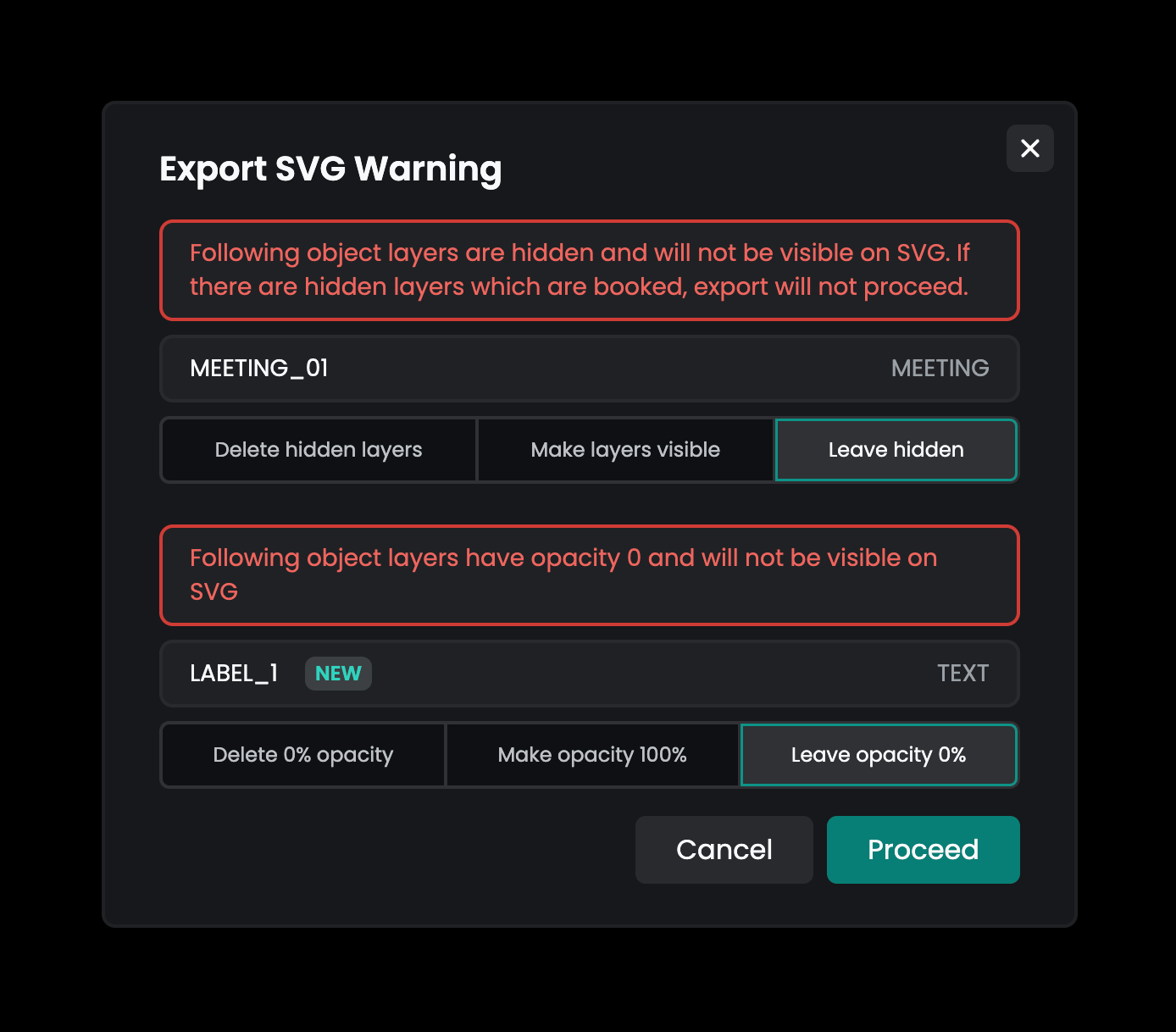 If there are hidden resources or text with 0% opacity on the map, you will be prompted to decide how to handle them during the export process. You can choose to include or exclude these elements.