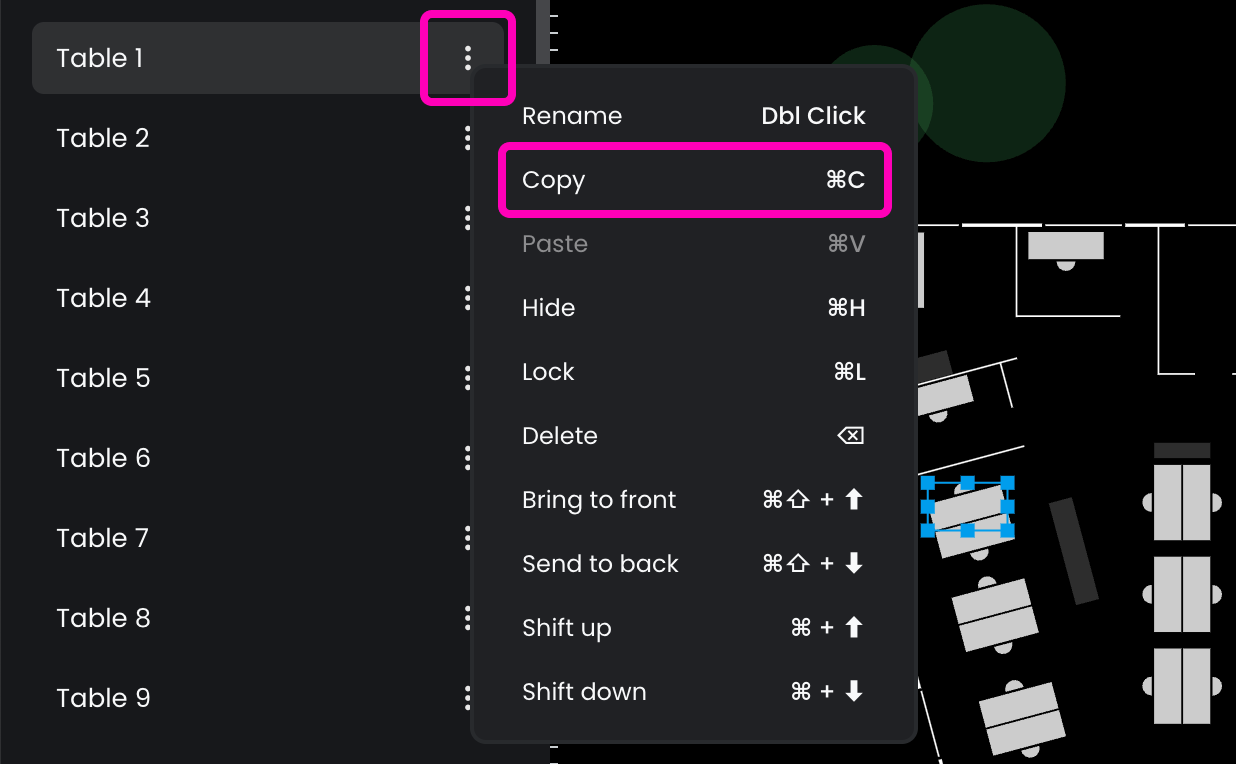 You can also copy a resource by opening the options menu (⋮) in the layers panel and selecting Copy.