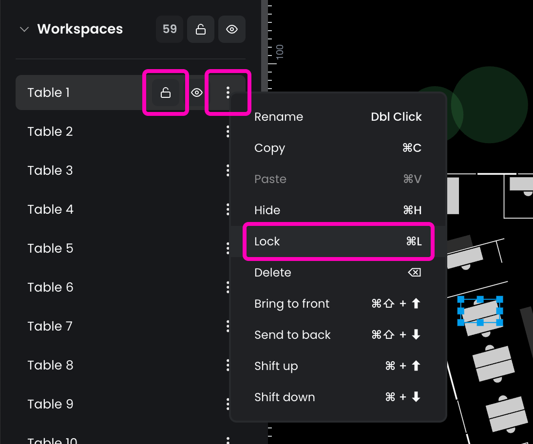 - Locking resources prevents unwanted changes while you focus on editing others. For example, after placing bookable desks, you may want to lock them while arranging furniture or decorations. On Basic Plans, the background image is locked by default to prevent accidental movement.