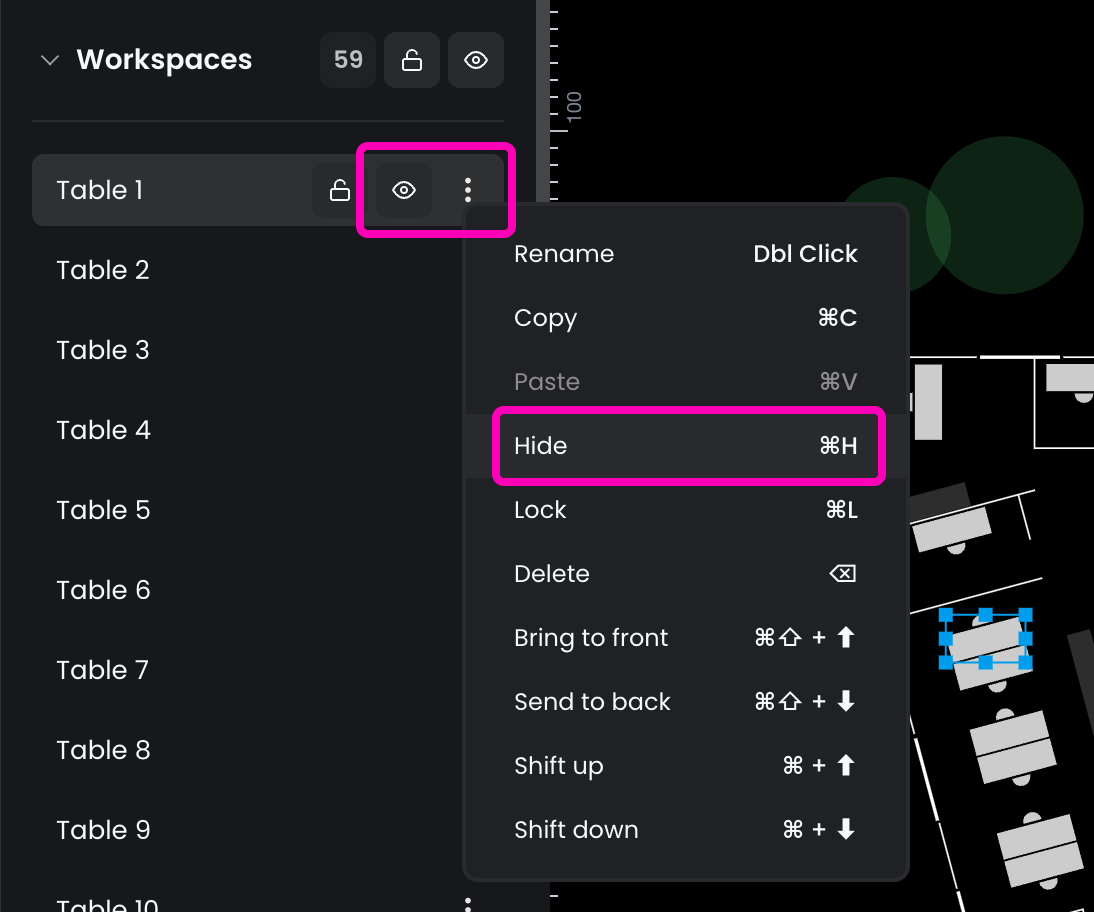 The hide feature is useful when you need to focus on a specific part of the plan or modify overlapping resources. Hidden resources are completely removed from the canvas but remain accessible through the layers panel.