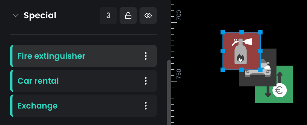 Resources on the plan are stacked in the same order as they appear in the layers panel. This means that the first resource in the list is displayed on top. Adjusting the order of layers can help ensure that resources are correctly displayed in relation to one another.