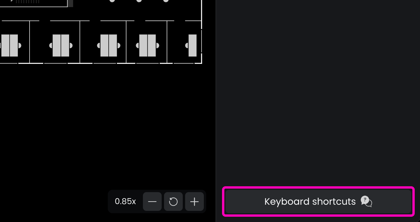 To make the Floorplanner easier to use, most actions have corresponding keyboard shortcuts. To view a full list of shortcuts, simply click on Keyboard Shortcuts in the bottom right corner of the application. This will display all available shortcuts for quicker navigation and editing.